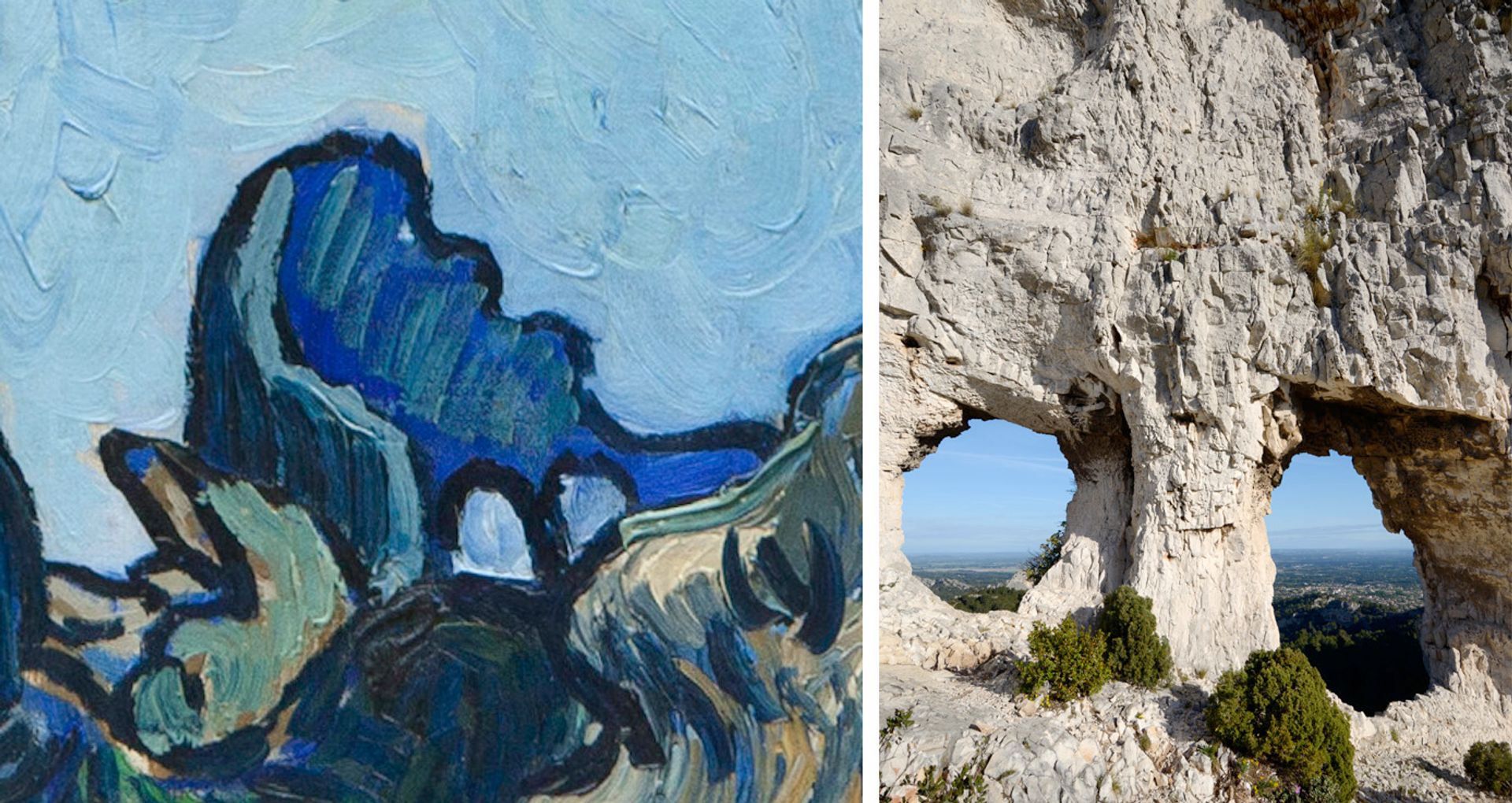 A detail of Van Gogh’s Mountains at Saint-Rémy and a photograph of Les Deux Trous (The Two Holes) Credit: Painting: Solomon R. Guggenheim Museum, New York (Thannhauser Collection, gift of Justin K. Thannhauser, 1978); Photo: Chris Hellier / Alamy Stock Photo
