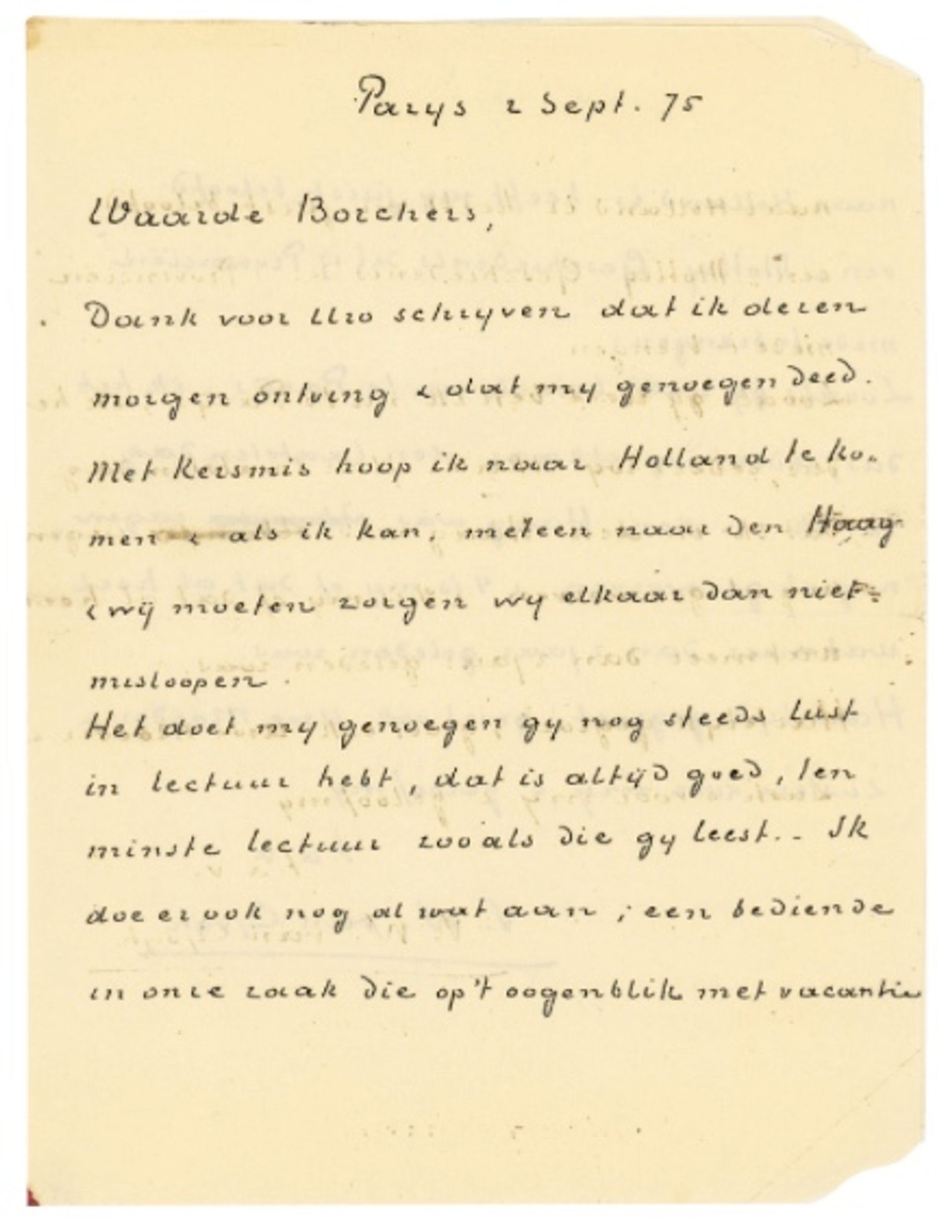 The letter, dated 2 September 1875, was sent to Egbert Borchers, a civil servant and friend in The Hague. It has only six sentences (160 words) of text—and no mention of art. If it sells for its mid-estimate on 15 June, the bidder will pay (with buyer’s premium) nearly $2,000 a word.