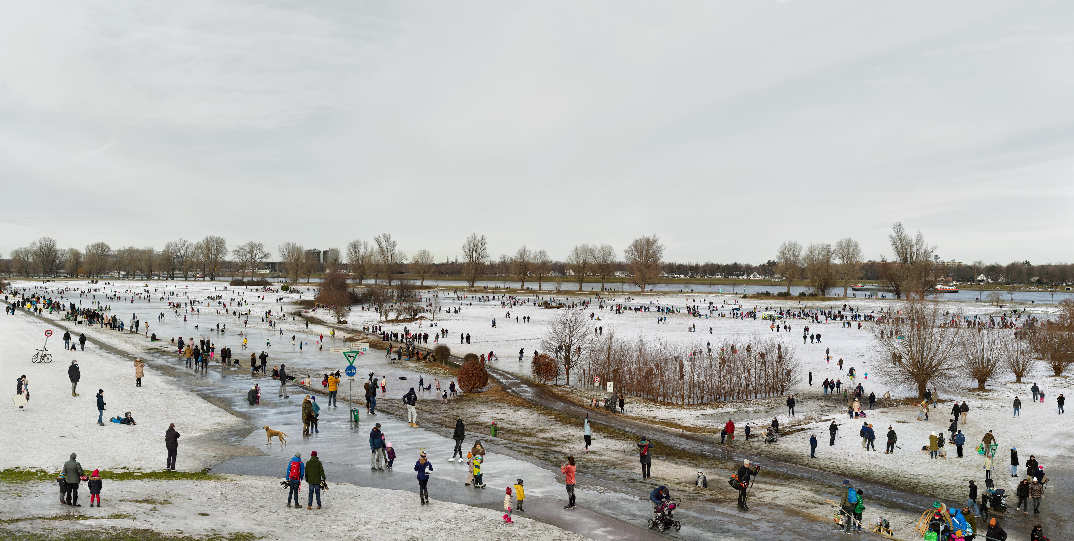 Covid-19 takes center stage in some of the images. Eisläufer (2021) was taken mid-pandemic. But instead of the solitude and contemplation so prevalent in Salinas, this picture is bursting with people. And while most of them seem to be enjoying themselves, ice skating or reveling in each other’s company on a winter day, the image was taken after flooding in Düselldorf covered the low-laying ground around the Rhine and the Rheinauen, which was then frozen solid after a massive cold snap. Friends and family gather around to skate and play ice hockey, but many are still trepidatious about the new reality and wear masks as the walk about or glide on the fresh ice.
