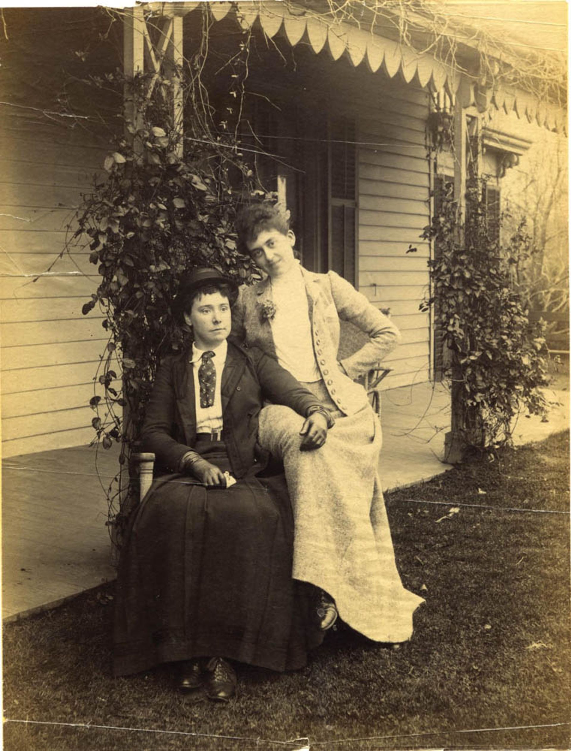 Violet Ward (left) and an unknown/unidentified friend sitting in front of Clear Comfort © Collection of the Alice Austen House Museum