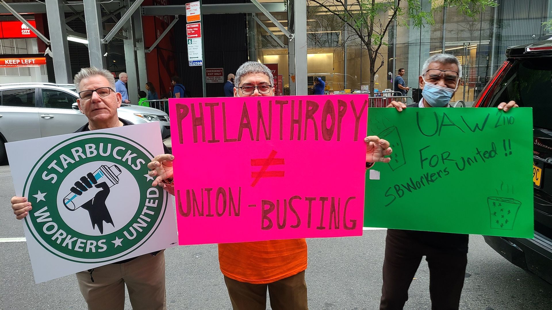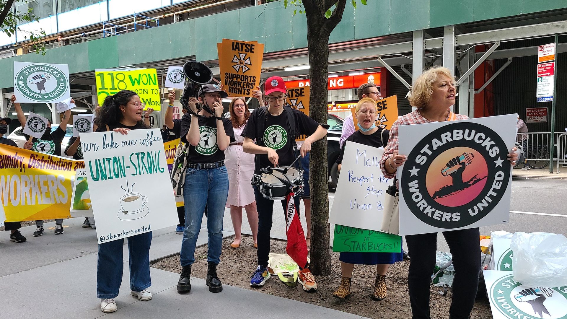 Maida Rosenstein, president of UAW Local 2110—which represents around 250 workers across several departments at MoMA—attended the protest to show support for Starbucks workers. “It’s a great time to be involved in the labour movement, with so many young workers organising,” she said. “Unionising is the only way for workers to have a democratic voice in the workplace. It enables them to safeguard and better their workplace conditions. It’s the only thing that will give workers any power or leverage to push for better conditions.”
