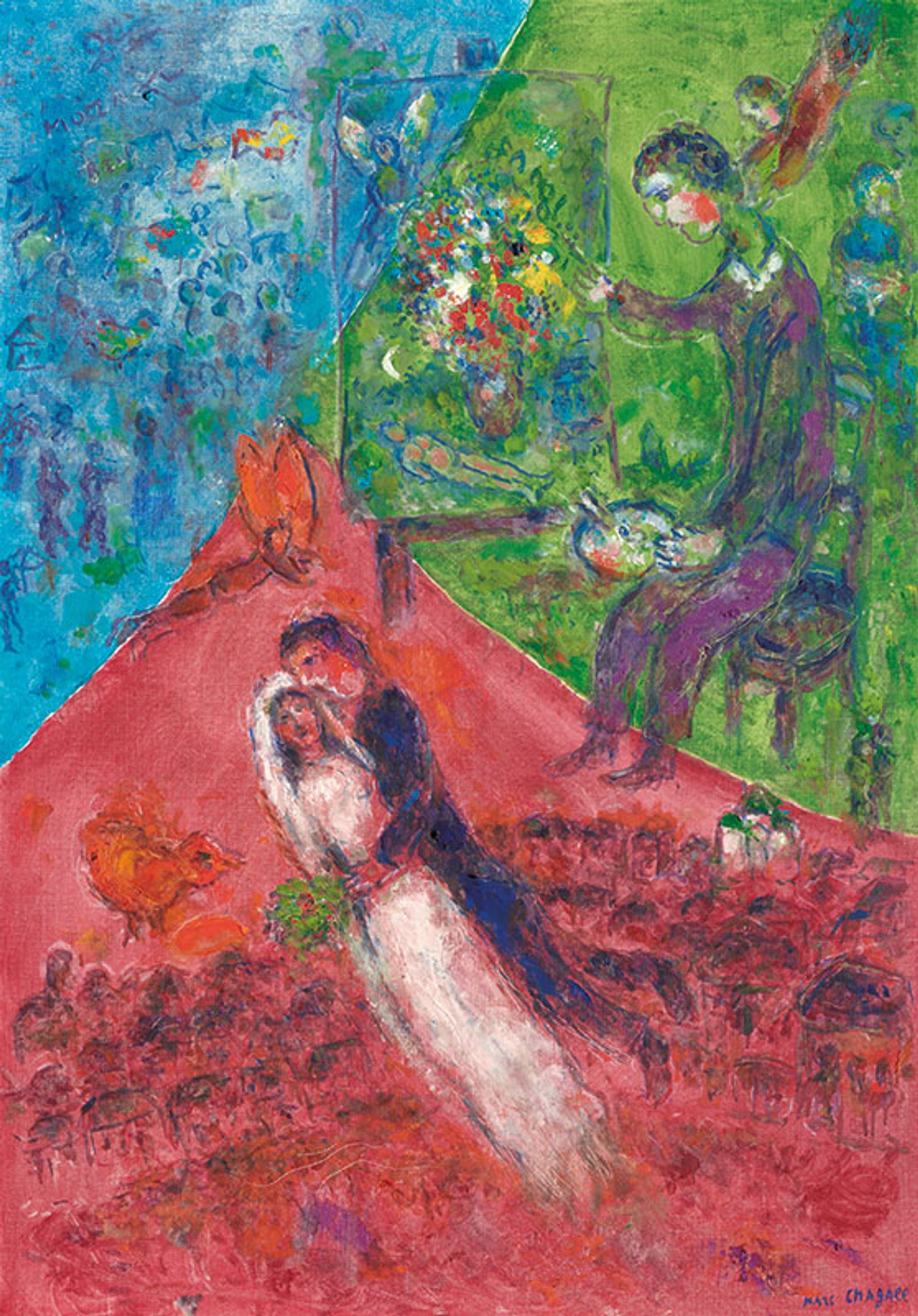 Marc Chagall, Le peintre et les mariés aux trois couleurs (1984)