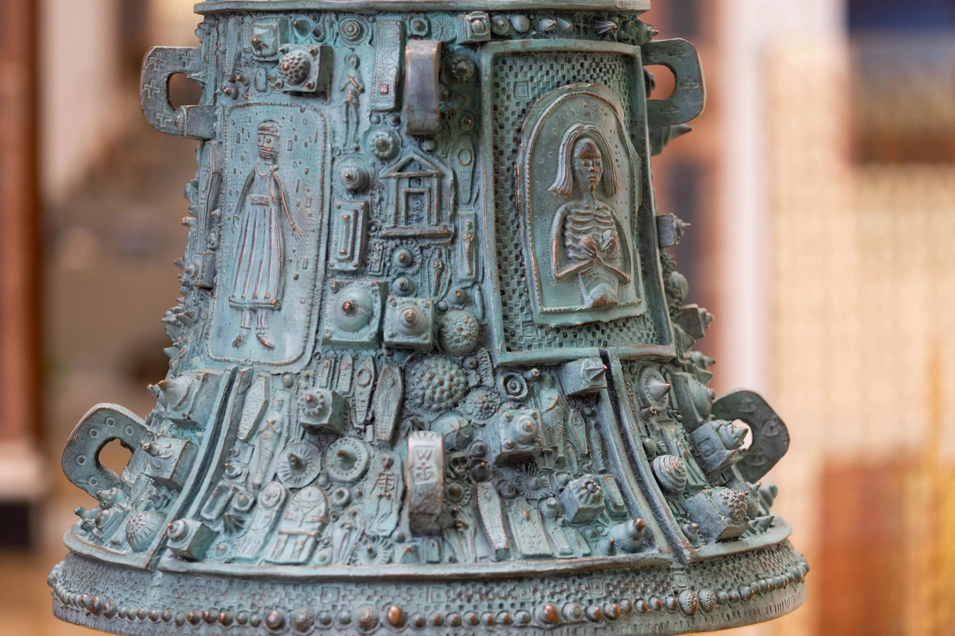 Perry says in a statement: “This bell I conceived as a memorial to the dead of the pandemic, it is covered in what looks like an aerial view of a multicultural cemetery. It also features a doctor and a patient. It could also be rung as a celebration that we have survived.” The Covid Bell was fabricated by the digital heritage preservation company Factum Foundation and cast by Pangolin Foundry in Gloucestershire.