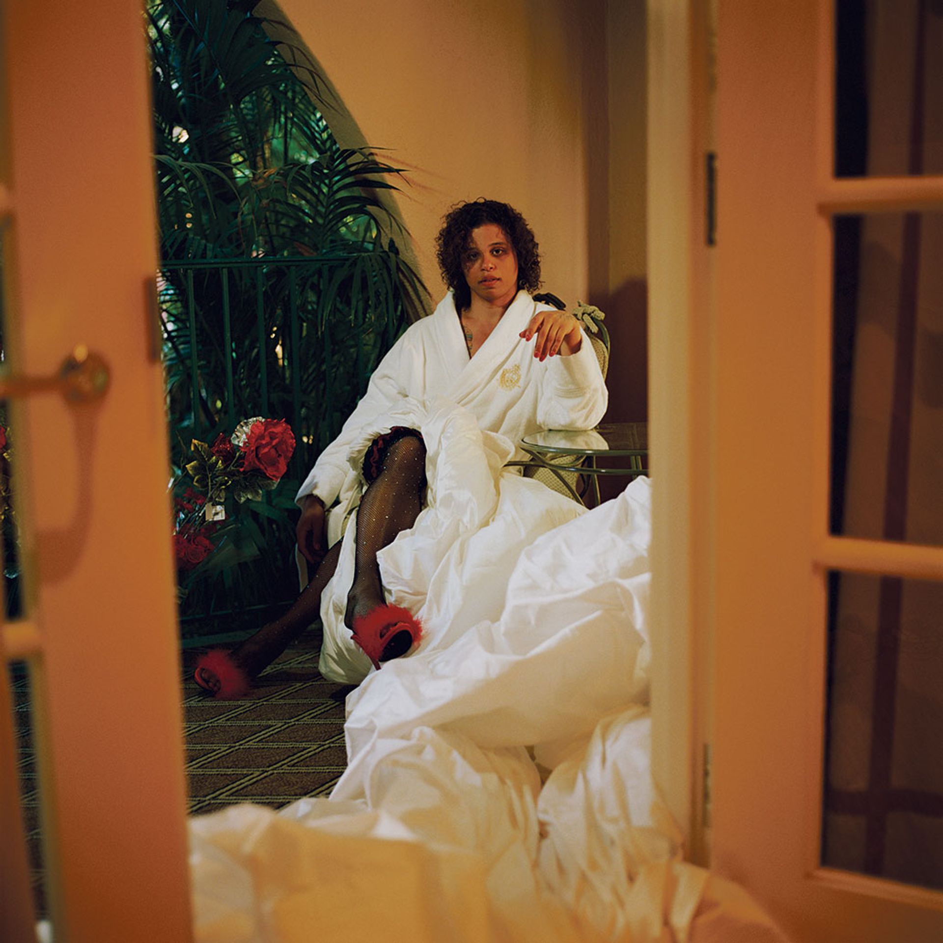 In the most arresting photograph from her solo stand at Art Basel, with the New York gallery Chapter NY, the artist and activist Tourmaline—wearing bright red pumps, matching nails and a plush white bathrobe that seems to extend forever—gazes at the viewer from her seat on a verdant terrace. The image was shot at the Beverly Hills Hotel in Los Angeles, which was renovated and expanded by the Black architect Paul R. Williams in the late 1940s, a time when he was not permitted to stay there due to discriminatory policies.
