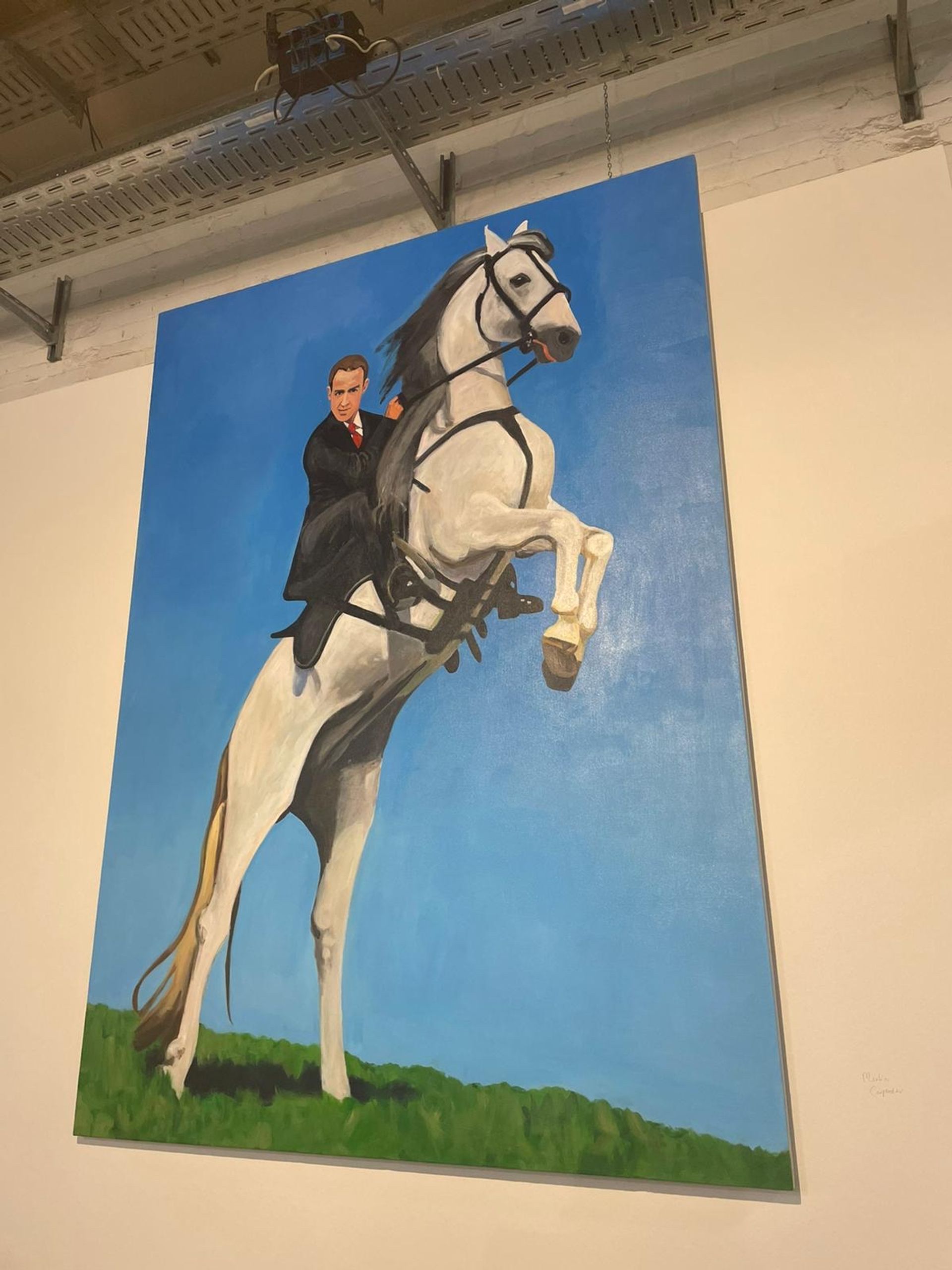 Merlin Carpenter is an artist from my generation, and our work has on occasion been placed in dialogue with one another, especially as we are both interested in readymades. He is not known to me for paintings so this work is something very left-field—but that's what makes it more interesting. The work is from a 2017 exhibition he did at Galerie Neu in Berlin, Business Women, and the man could represent any technocrat in a suit—Tony Blair, Emmanuel Macron, you name it. I also like how the gallery have hung the work, so it extends off the wall. It reminds me of my rocket—too big for Basel!"