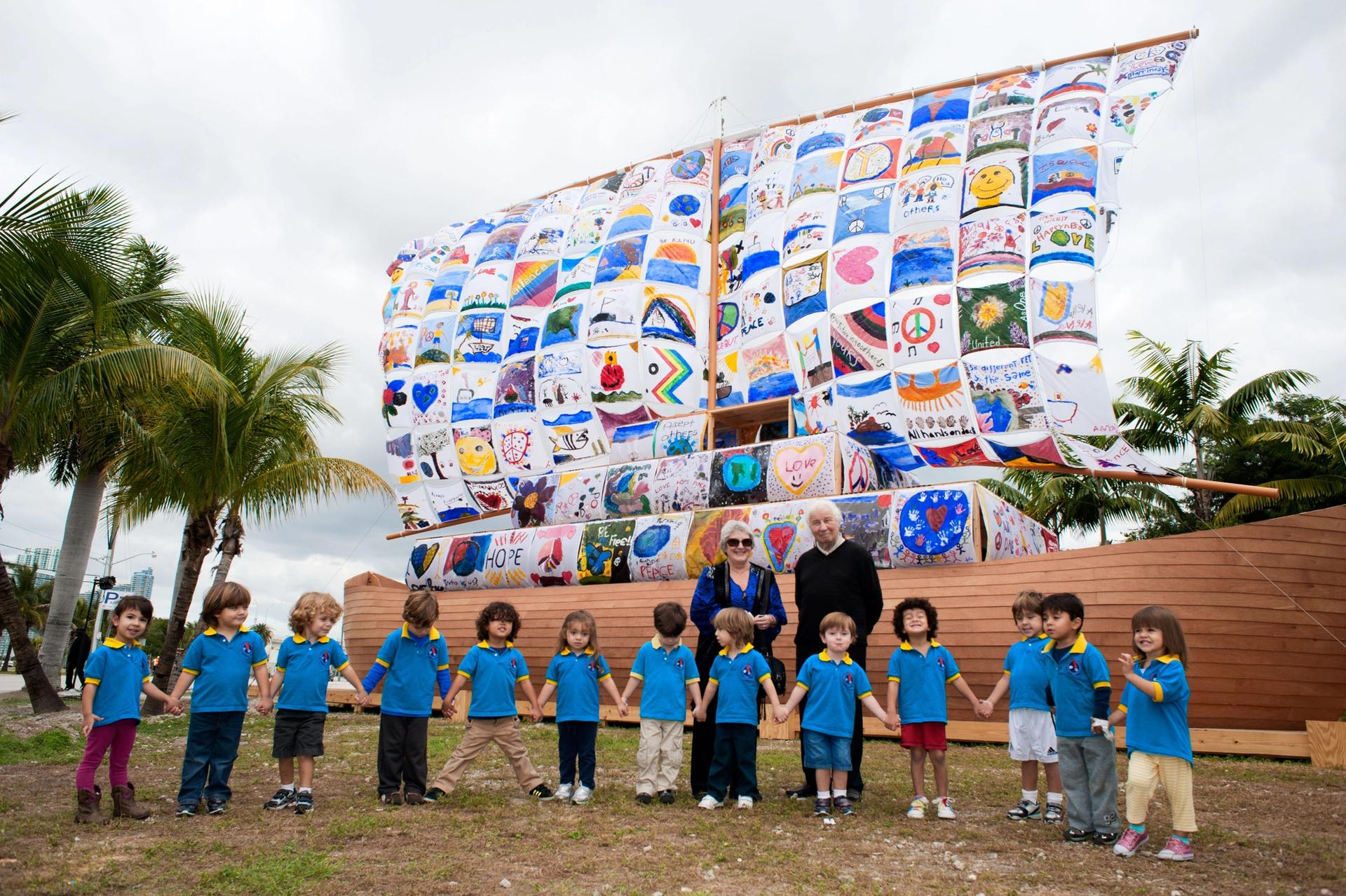 Ilya and Emilia Kabakov's The Ship of Tolerance (2005-ongoing) in Miami in 2011. The project involves collaborating with schoolchildren, who make paintings based on the meaning of tolerance that are then combined to make the sail of a ship Courtesy of the artists