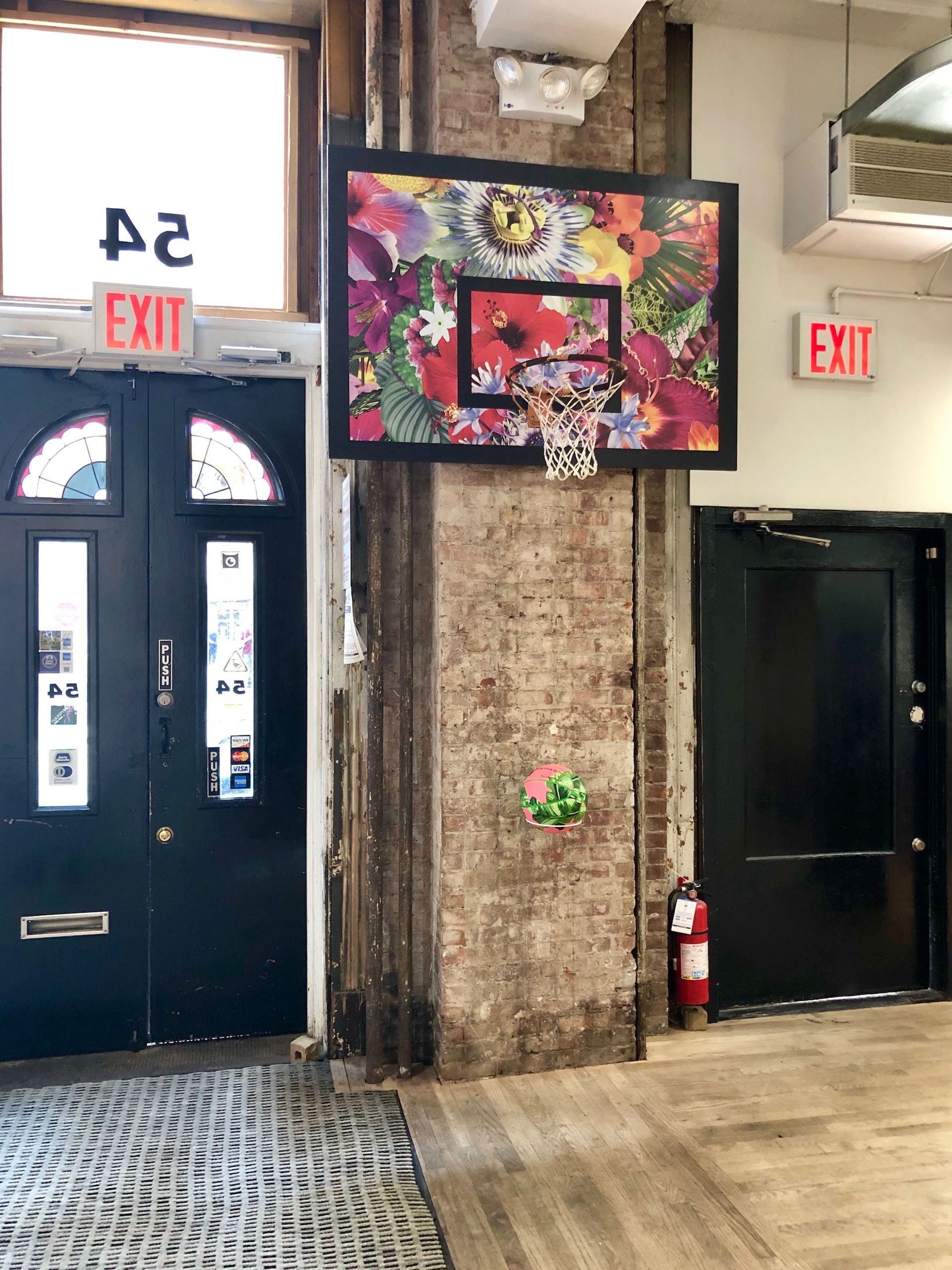 The main entrance to Postmasters, with a basketball installation by Carlos Rolon (2020) Courtesy Postmasters