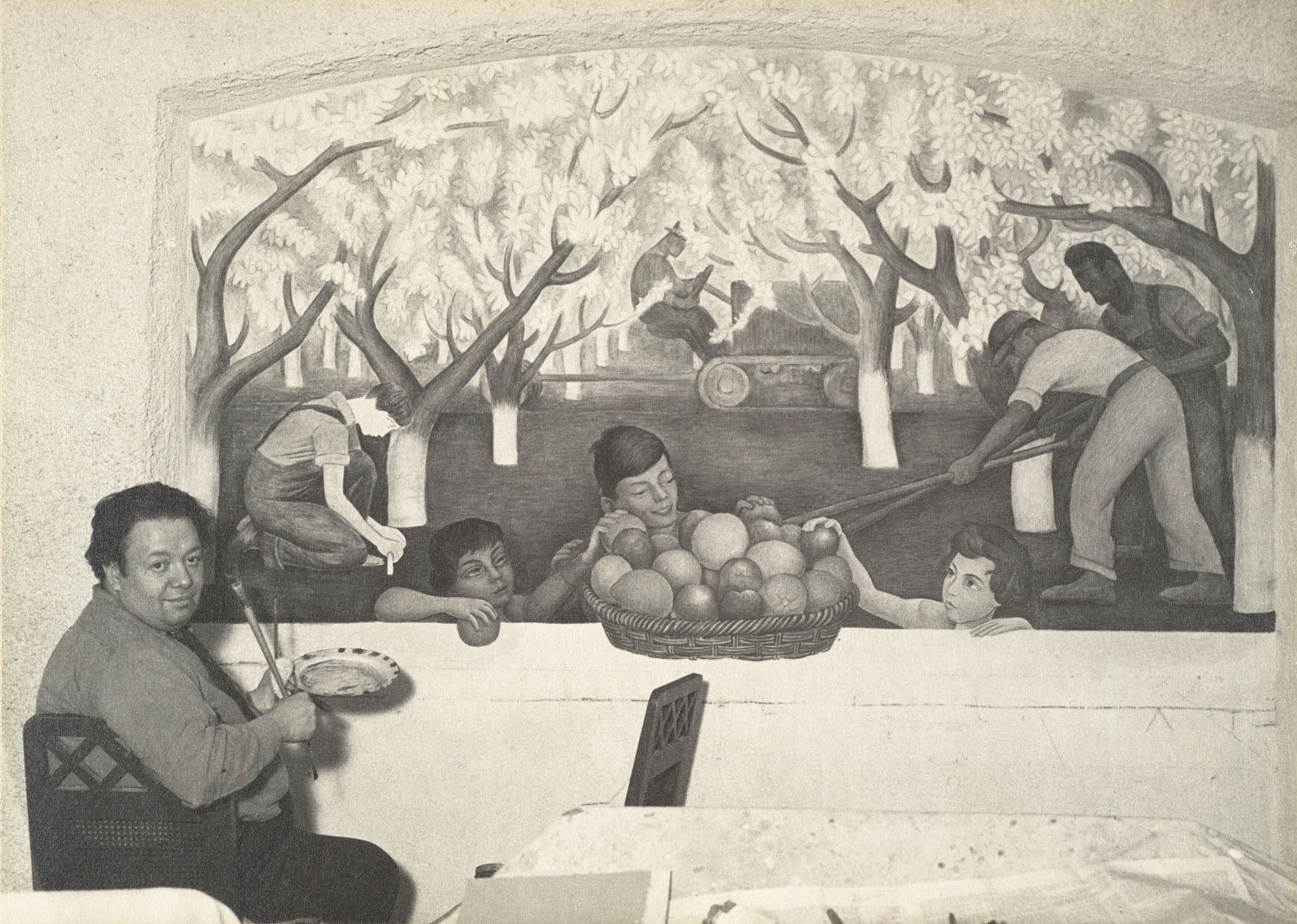 Ansel Adams's photograph of Rivera painting the fresco Still Life and Blossoming Almond Trees (1930-31) © The Ansel Adams Publishing Rights Trust