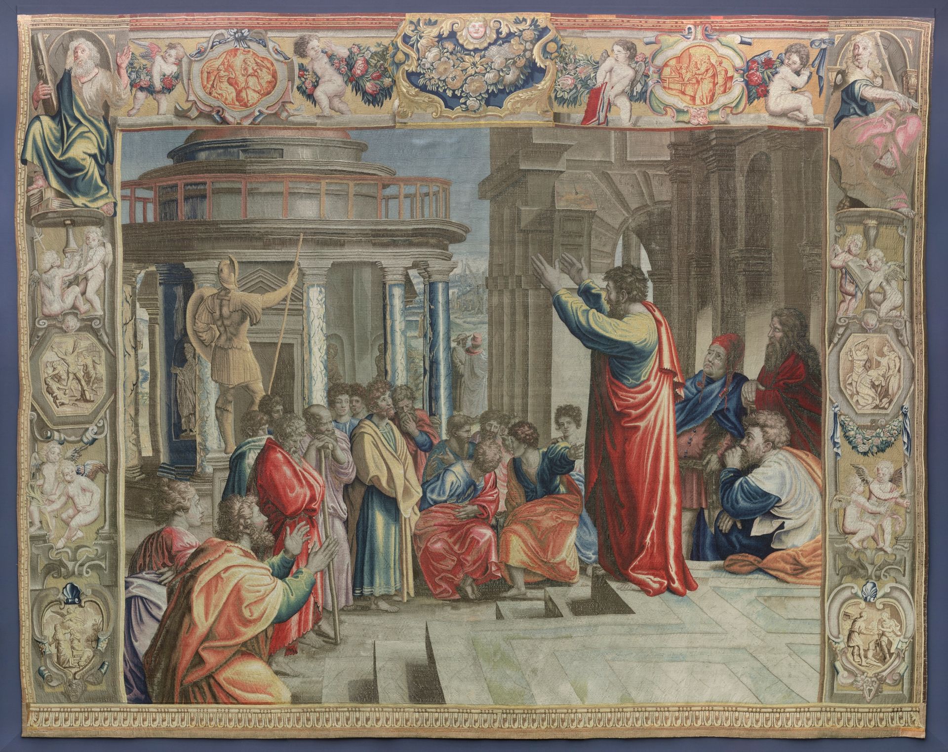Mortlake manufactory after designs by Raphael, St. Paul Preaching at Athens (after 1625). Staatliche Kunstsammlungen Dresden, Gemäldegalerie Alte Meister.