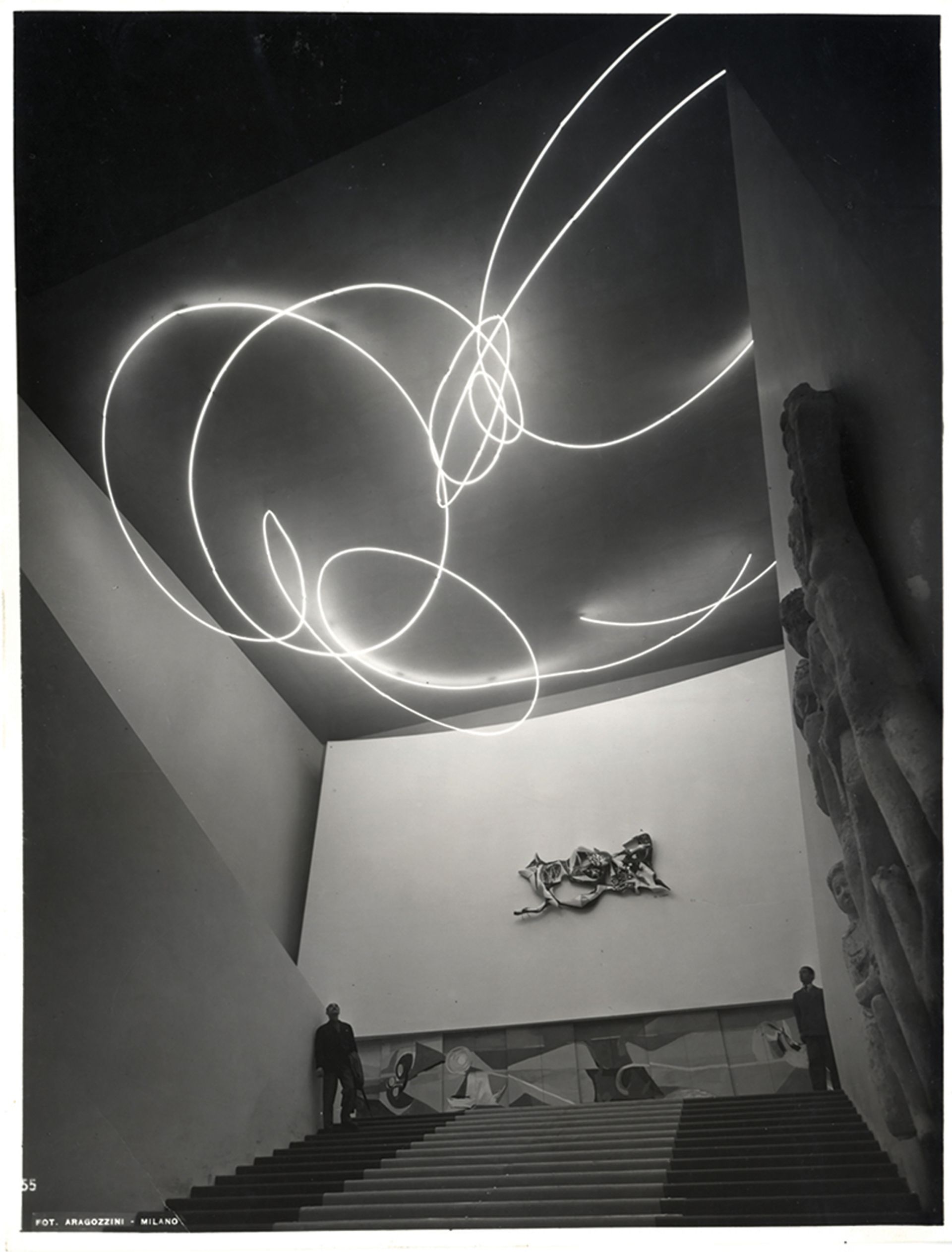 Lucio Fontana’s neon light installation Luce spaziale on the main staircase, a star exhibit at Triennale Milano's first great post-war international exhibition, in 1951, floating above a ceramic piece by Neto Campi and a mural by Giuseppe Ajmone Triennale Milano—Foto Aragozzini