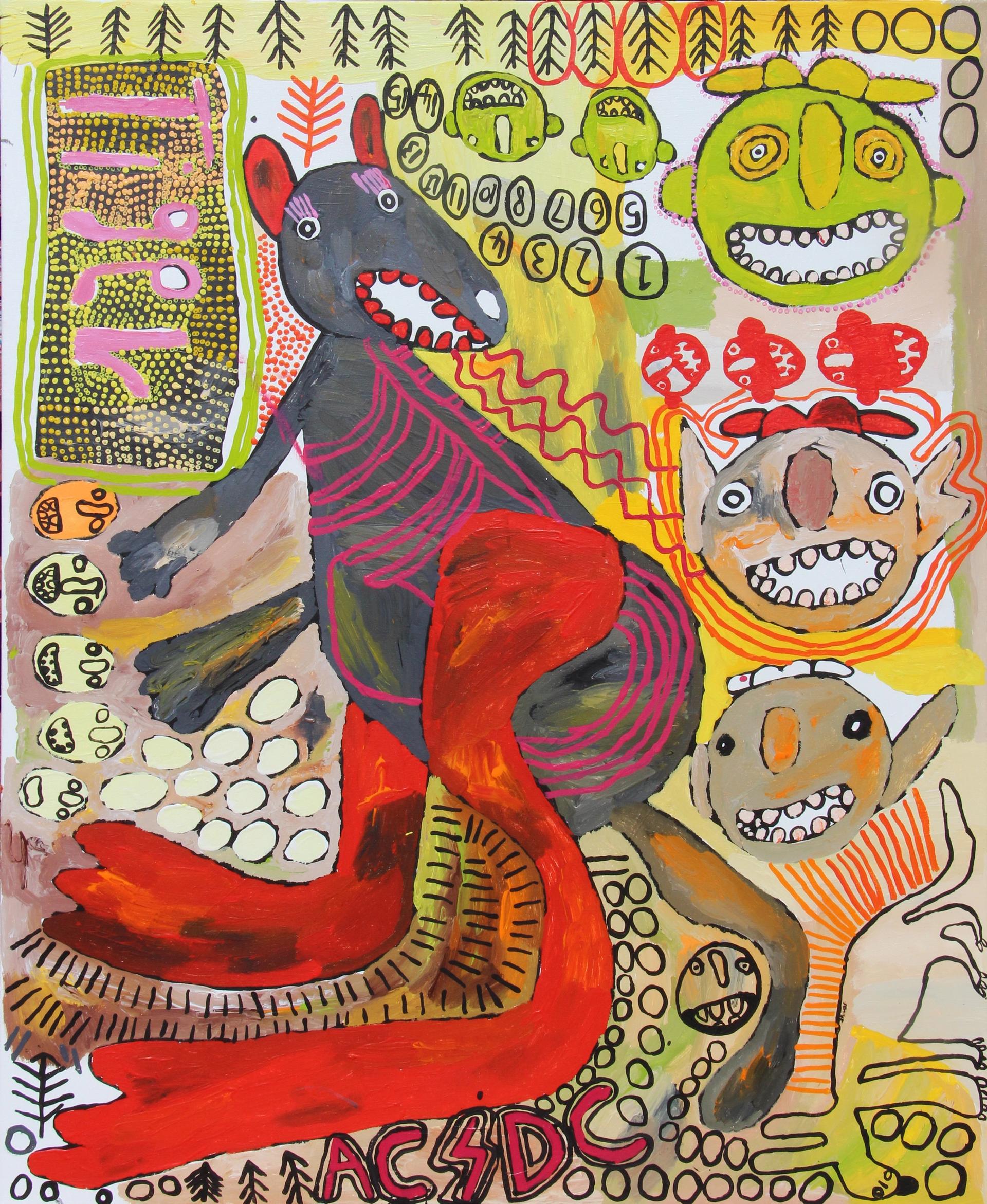 Artistic rebellion began sprouting in the Iwantja Arts community around ten years ago. One of the largest of about 30 art communities connected within one hour drive on the Aṉangu Pitjantjatjara Yankunytjatjara (APY) Lands, the center was founded by Aboriginal artists Alec Baker and Sadie Singer around 40 years ago. The main goal then was to pass Indigenous craft techniques across generations; however, a growing number of younger artists have started veering toward figurative painting to discuss social topics with a dash of humour. After learning the region’s established dot painting tradition and watercolour, they now filter their knowledge through a Pop sensibility in favour of social commentary.