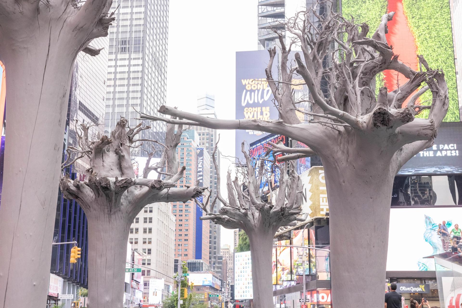 Gaines unveiled Chapter One of the serial project in Times Square last week (13 July). The work includes an act in two parts: a site-specific sculptural installation and a performance. The sculptural work, titled Roots, comprises seven inverted American Sweetgum trees, a species once native to the area, that are dried and painted to haunting effect. Backgrounded by a dizzying array of LED-branded architecture, the work analogises the pervasive repercussions of America’s legacy of cultural displacement and violent subjugation of property for capital gain.