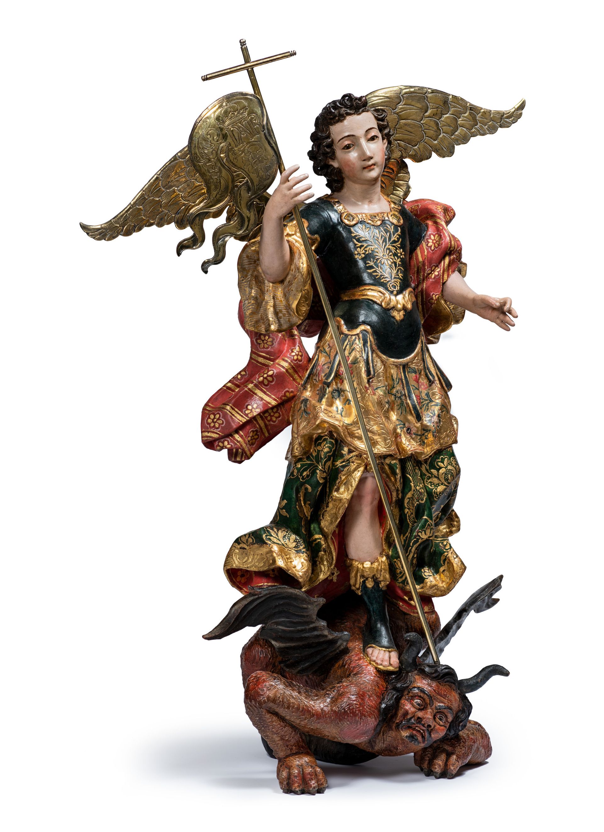 Unidentified sculptor and polychromer, Saint Michael Vanquishing the Devil (San Miguel triunfante sobre el demonio), Guatemala, second half of the 18th century, Los Angeles County Museum of Art, Purchased with funds provided by the Bernard and Edith Lewin Collection of Mexican Art Deaccession Fund © Museum Associates/Lacma