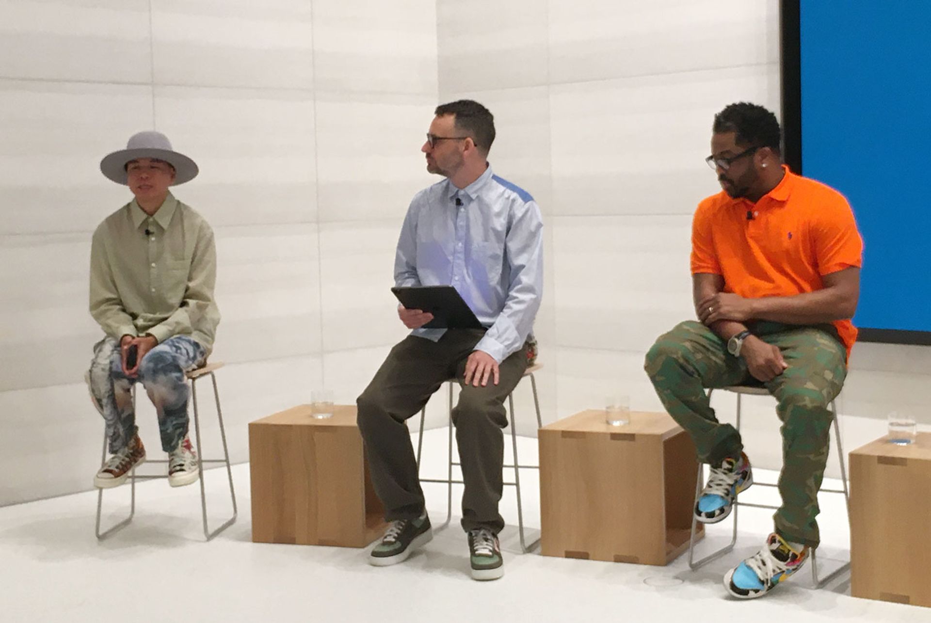Tin Nguyen (left), Ed Cutting and Just Blaze discuss their collaboration in the creation of United Visions at the Apple Store, Brompton Road, London Louis Jebb