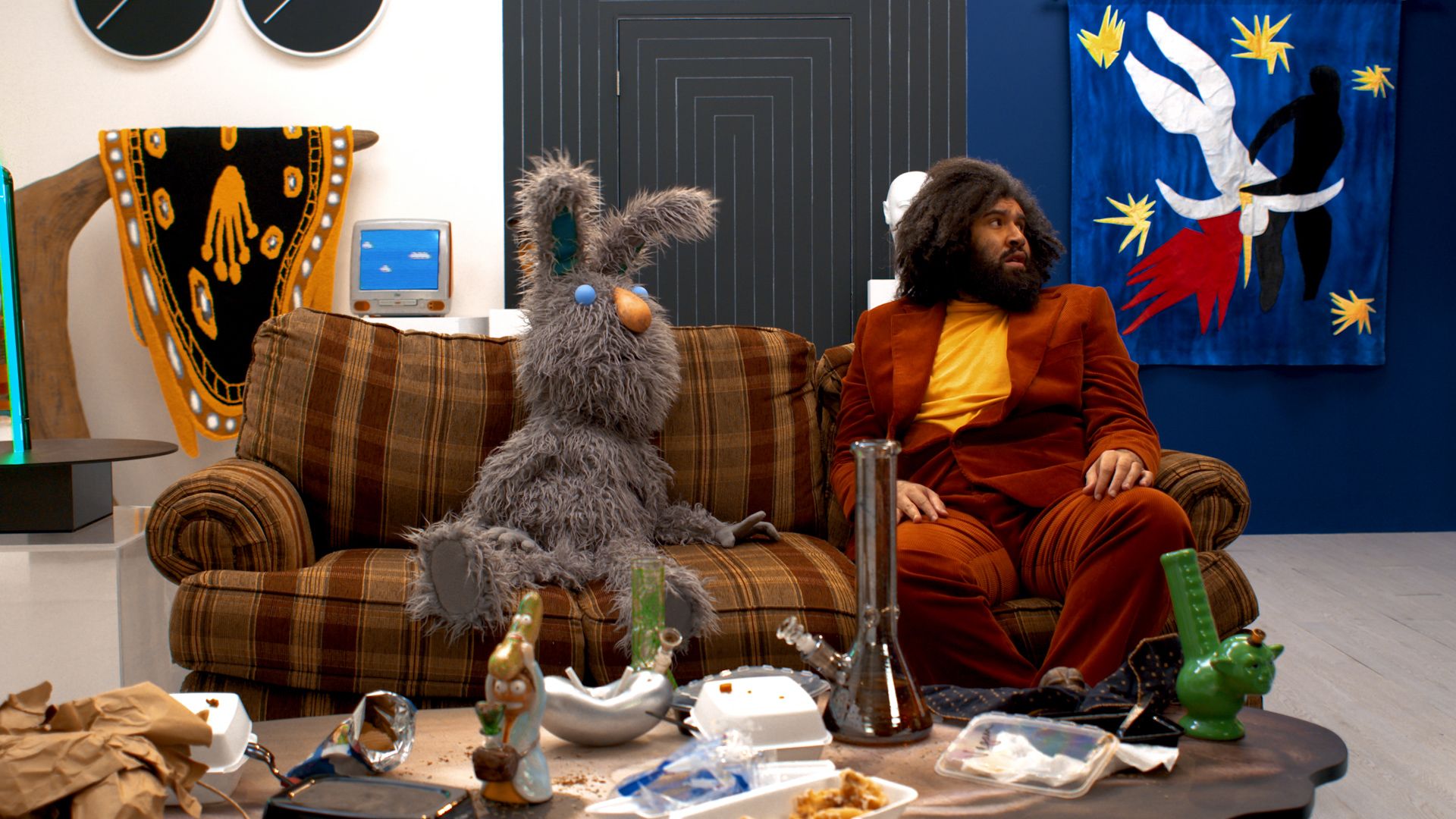 “Ollie” (left), puppeteered by Cedwan Hooks with Jimmica Collins, and “Jay” (right), performed by Jayson Musson. Jayson Musson, Still from Episode 2: Caveman Days (2022). Jayson Musson, in collaboration with The Fabric Workshop and Museum, Philadelphia, His History of Art (2022). Video still courtesy of the artist.