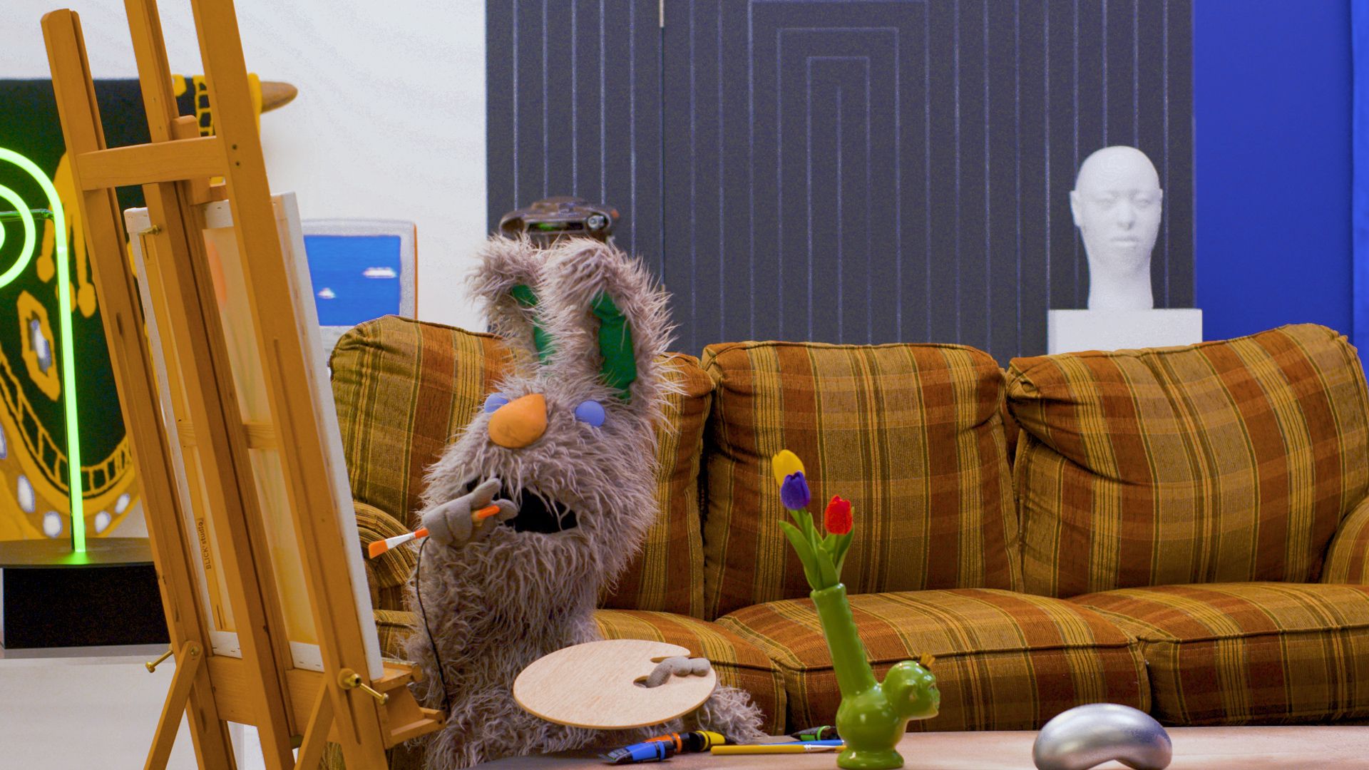 “Ollie”, puppeteered by Cedwan Hooks with Jimmica Collins, paints a still life. Jayson Musson, Still from Episode 3: Dipping Toes (2022). Jayson Musson, in collaboration with The Fabric Workshop and Museum, Philadelphia, His History of Art (2022). Video still courtesy of the artist.