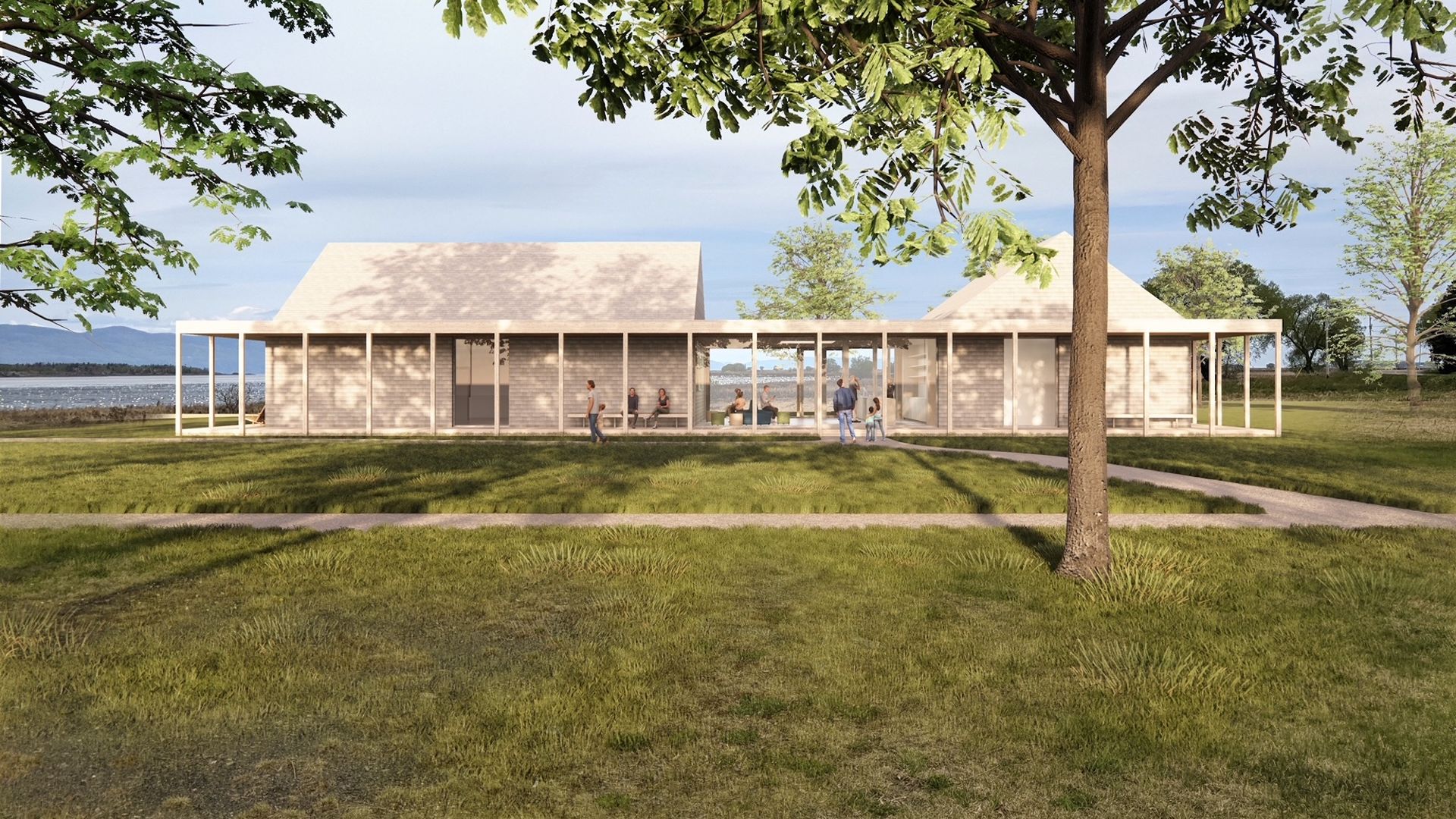 Plans for the museum, designed by the architecture firm Atelier Pierre Thibault, call for two wood-shingled structures—one modelled on Riopelle’s house on Île-aux-Oies, the other on his studio in the Laurentian mountains—with a glass-walled vestibule connecting them and a covered veranda with benches running around the entire exterior of the building.