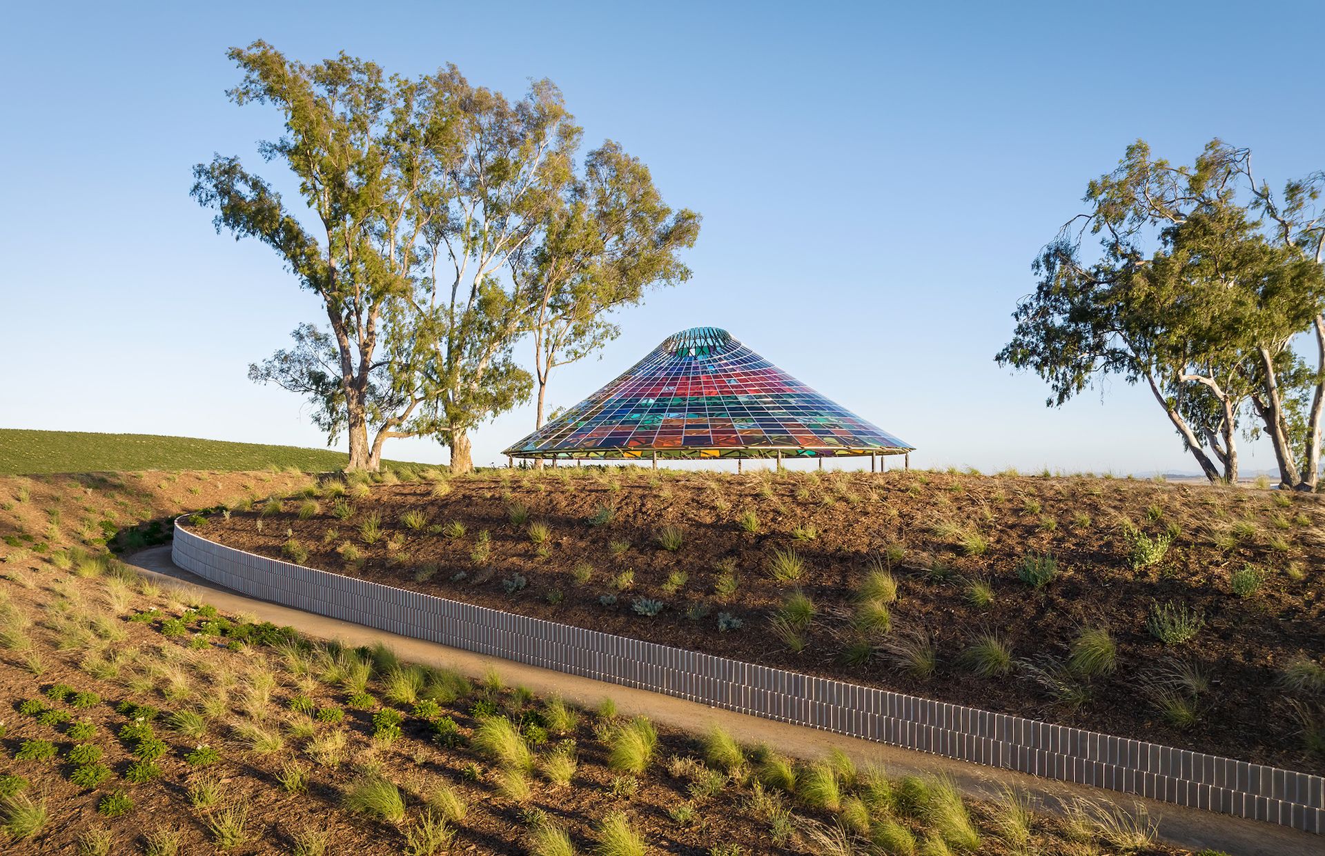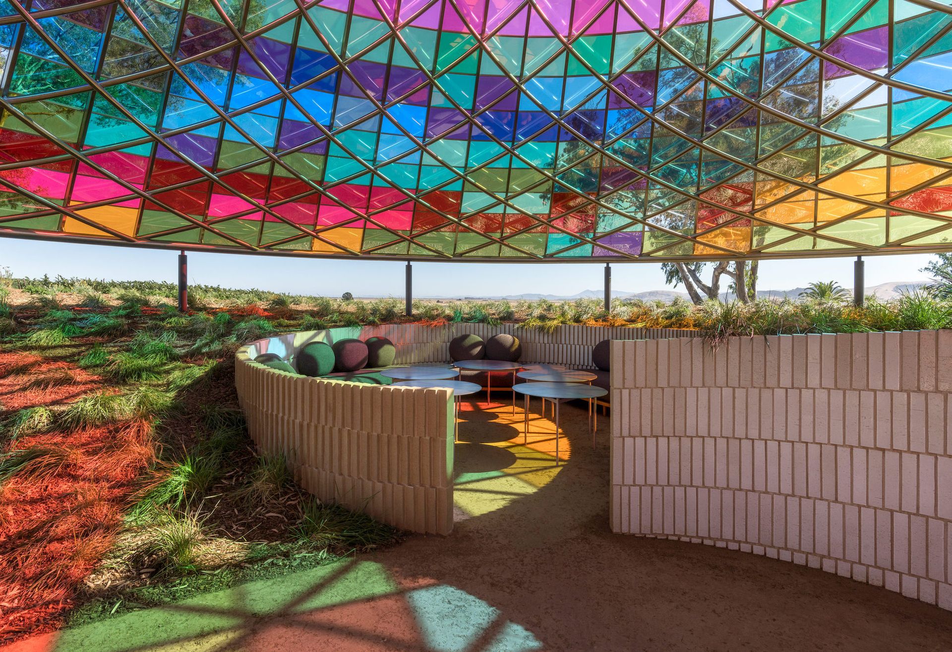 The duo, whose collaborative design practice is called Studio Other Spaces, carefully considered Donum’s focus on organic, sustainable production, as well as its specific terrain and meteorological parameters to translate the winemaking process into a physical experience. The pavilion is accessed via winding paths lined with bricks glazed white on one side, which gradually grow into the site’s walled foundation. Inspired by the history of circular calendars, the pavilion’s roof features 832 laminated panels of recycled glass and is supported by 12 stainless-steel columns. From afar, only the translucent rainbow glass tiled canopy can be seen. Upon entering the pavilion, visitors find themselves at eye level with the surrounding roots and greenery due to the structure’s sunken soil floor.