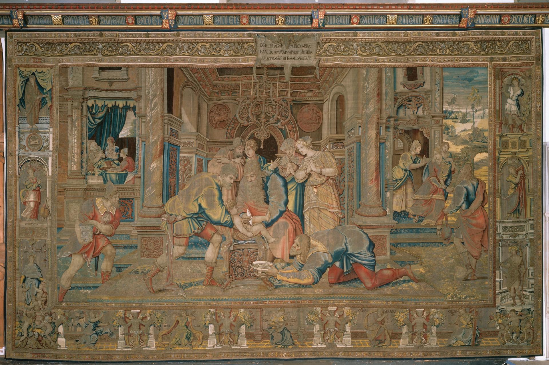 The Circumcision of Isaac is from the ten-piece tapestry set of the Story of Abraham that Henry VIII purchased in the early 1540s and that, remarkably, survives in entirety at Hampton Court. Lavishly woven with masses of gilt thread and with a total length of more than 80m, the ensemble is the most impressive tapestry set to survive in Britain.