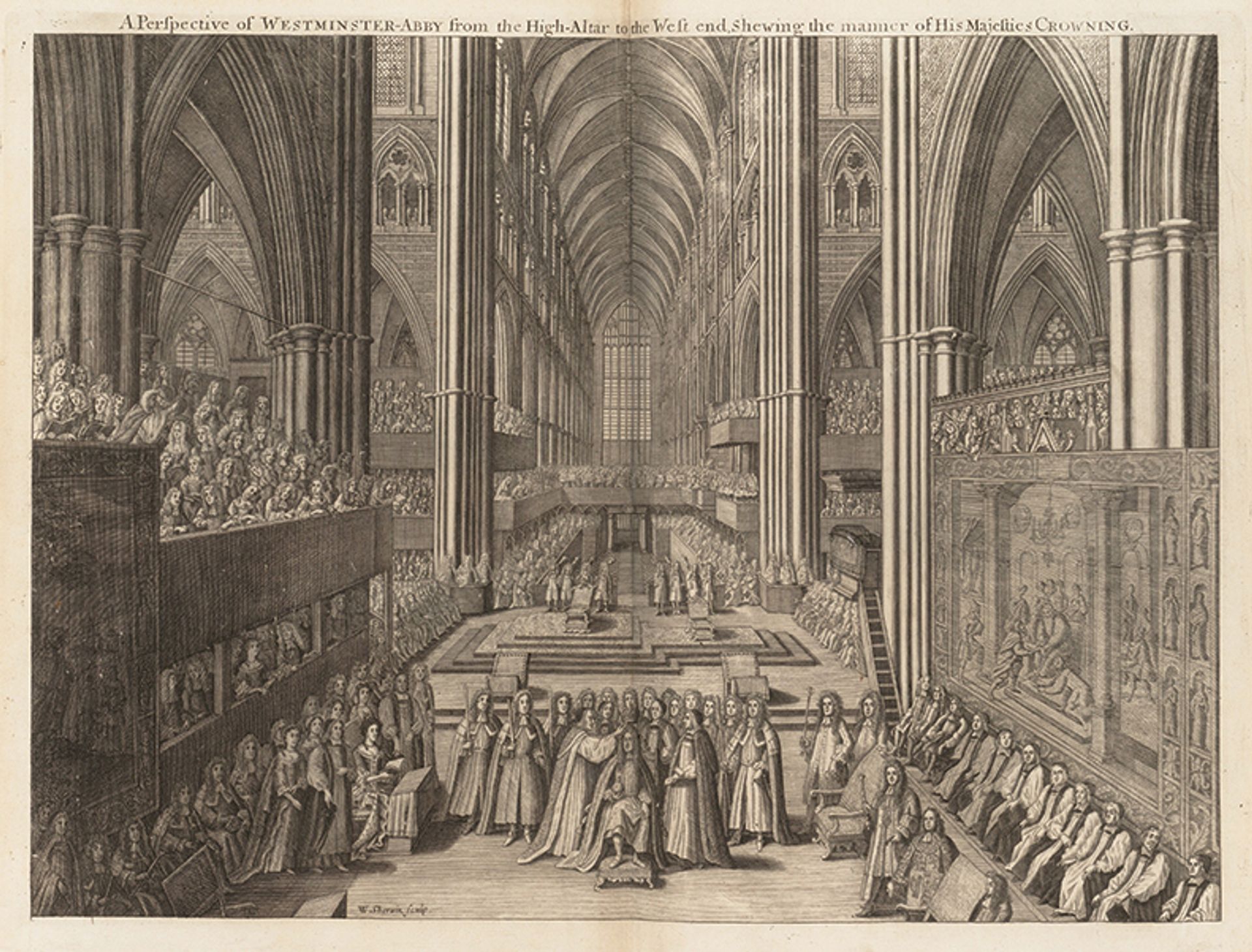 An illustration from Francis Sandford’s The History of the Coronation of James II (1687) depicts The Circumcision of Isaac next to the coronation throne Courtesy of the Metropolitan Museum of Art, New York and the Harris Brisbane Dick Fund, 1943