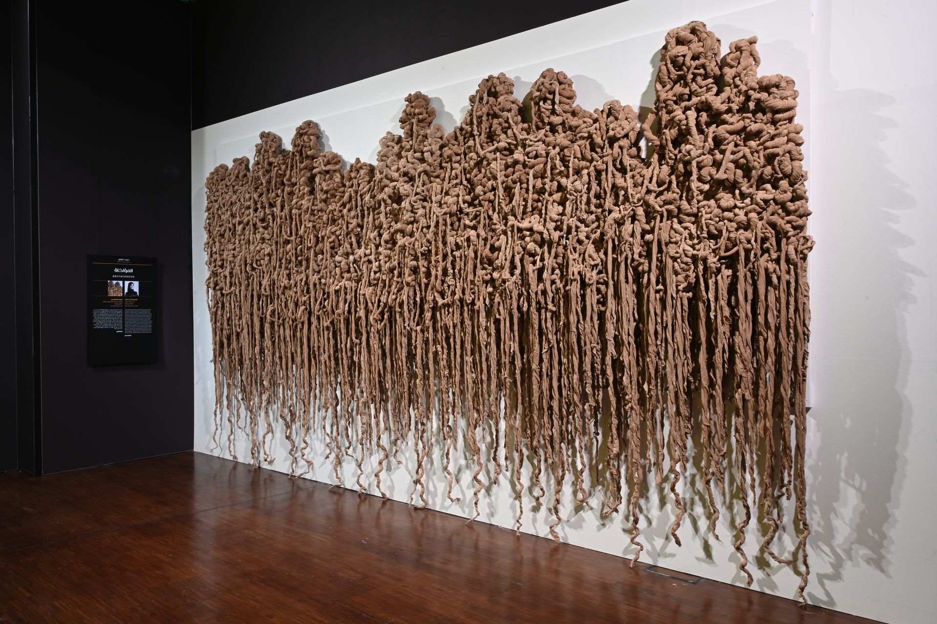 “For example we have worked with Nuria Garcia, who's a Spanish calligrapher, to create what's called a hilye, which is a calligraphic portrait of words of the prophet,” Trevathan says. “We also have a work by Zahrah Al Ghamdi, which is a very contemporary piece where she got pieces of fabric, dipped them into earth and knotted them to create what resembles the roots of great tree. She links it to a concept of brotherhood, where the Ansar, the people of Medina, and the Muhajirun, the people who travelled from Mecca, came together and created this new community.”