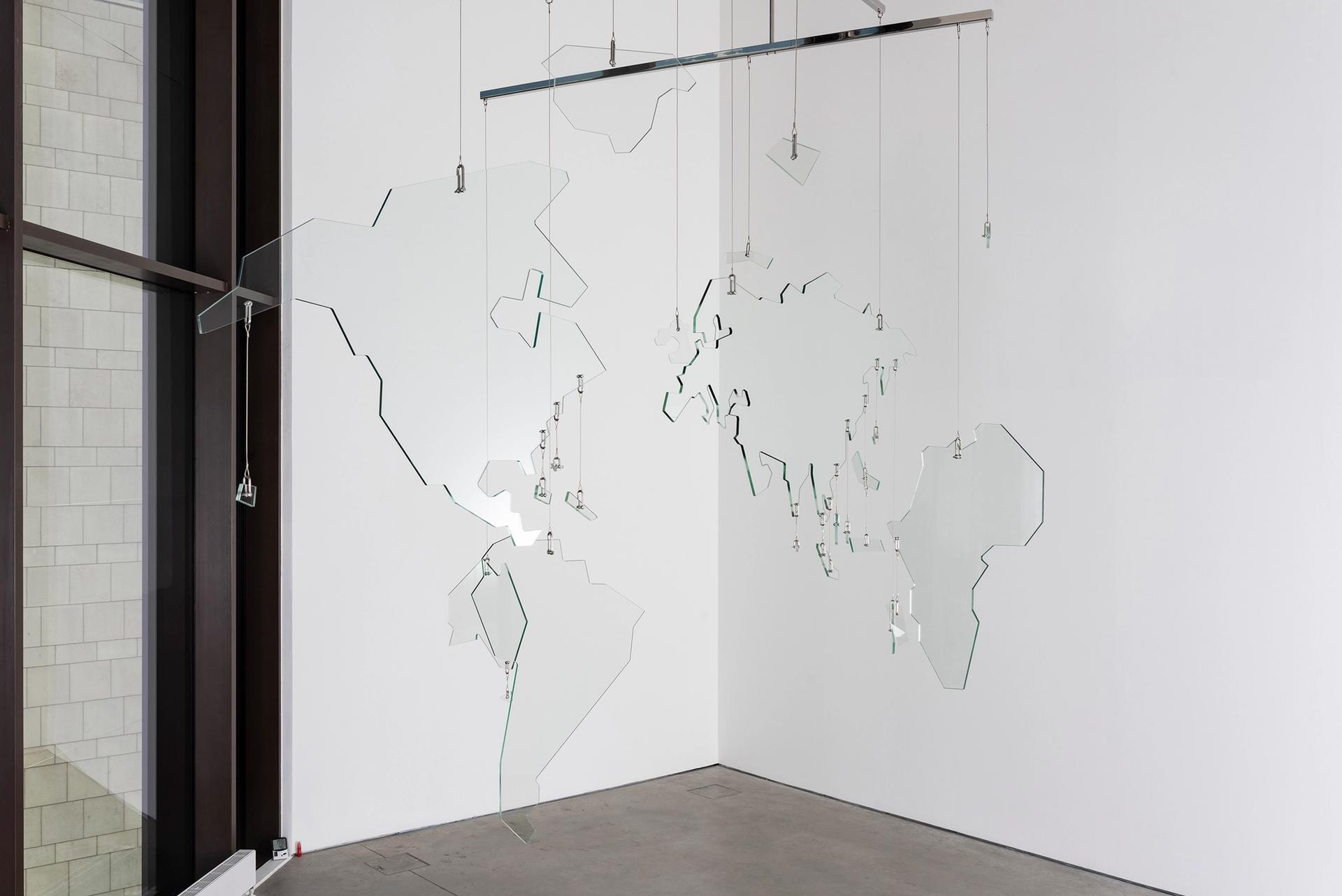 For the show, he has brought together works by artists such as Kader Attia, who shows a new film, and the late artist Zarina, known for her sparse drawings of maps and floorplans. Two works by the British Palestinian artist Mona Hatoum are also included: a fragmented world map made of glass that is suspended from a mobile, and sculptural installation featuring a paper map, cut up and refashioned into a bag.