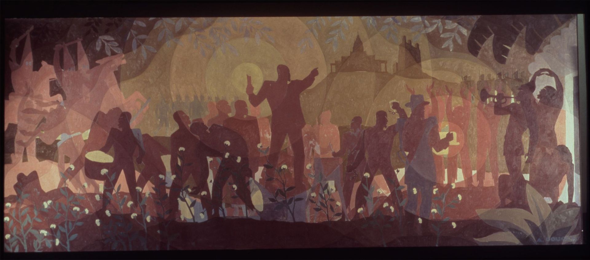 Aaron Douglas, Aspects of Negro Life: From Slavery to Reconstruction (1934), from the Aspects of Negro Life mural series Schomburg Center for Research in Black Culture, Art and Artifacts Division, The New York Public Library
