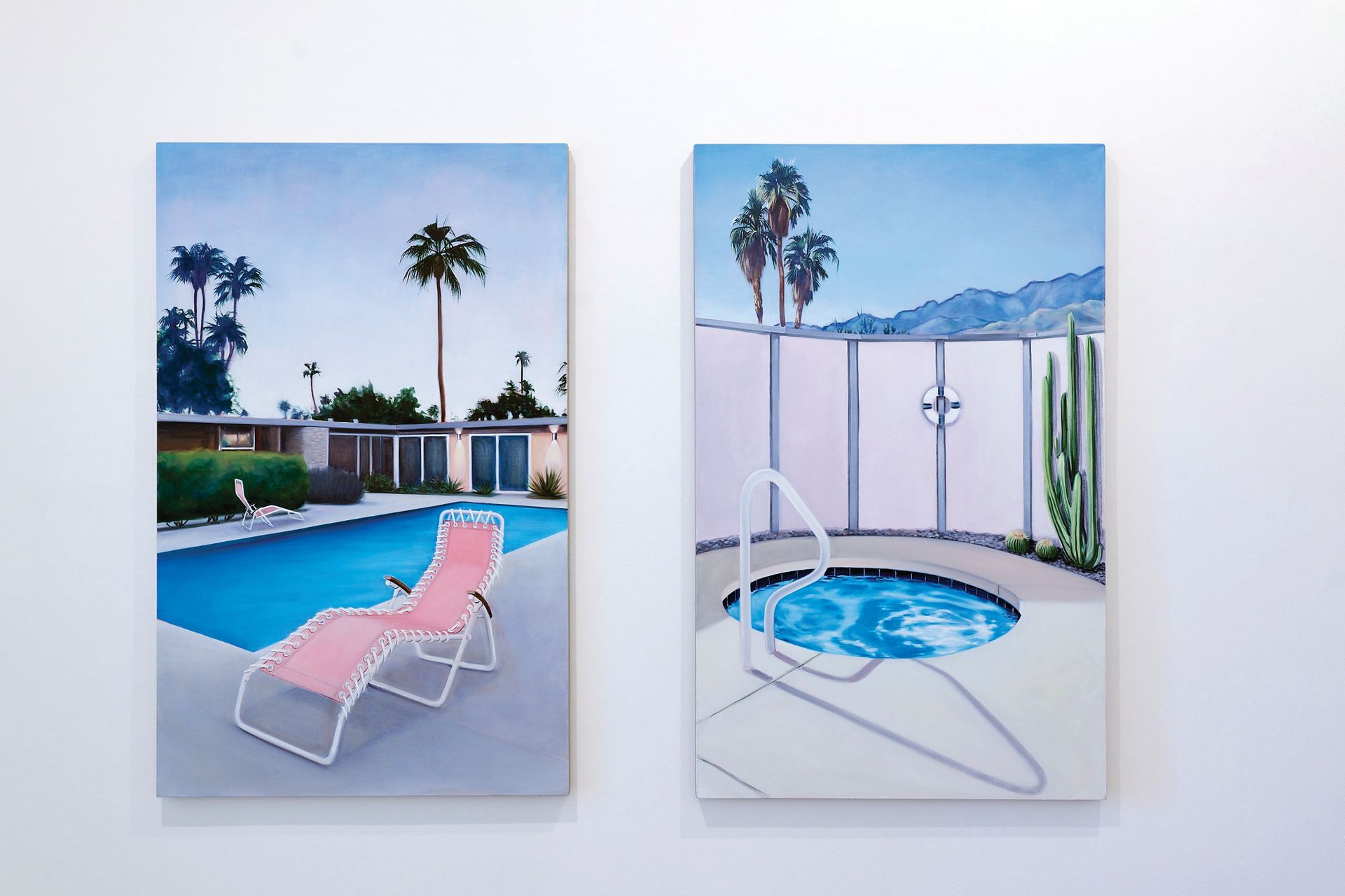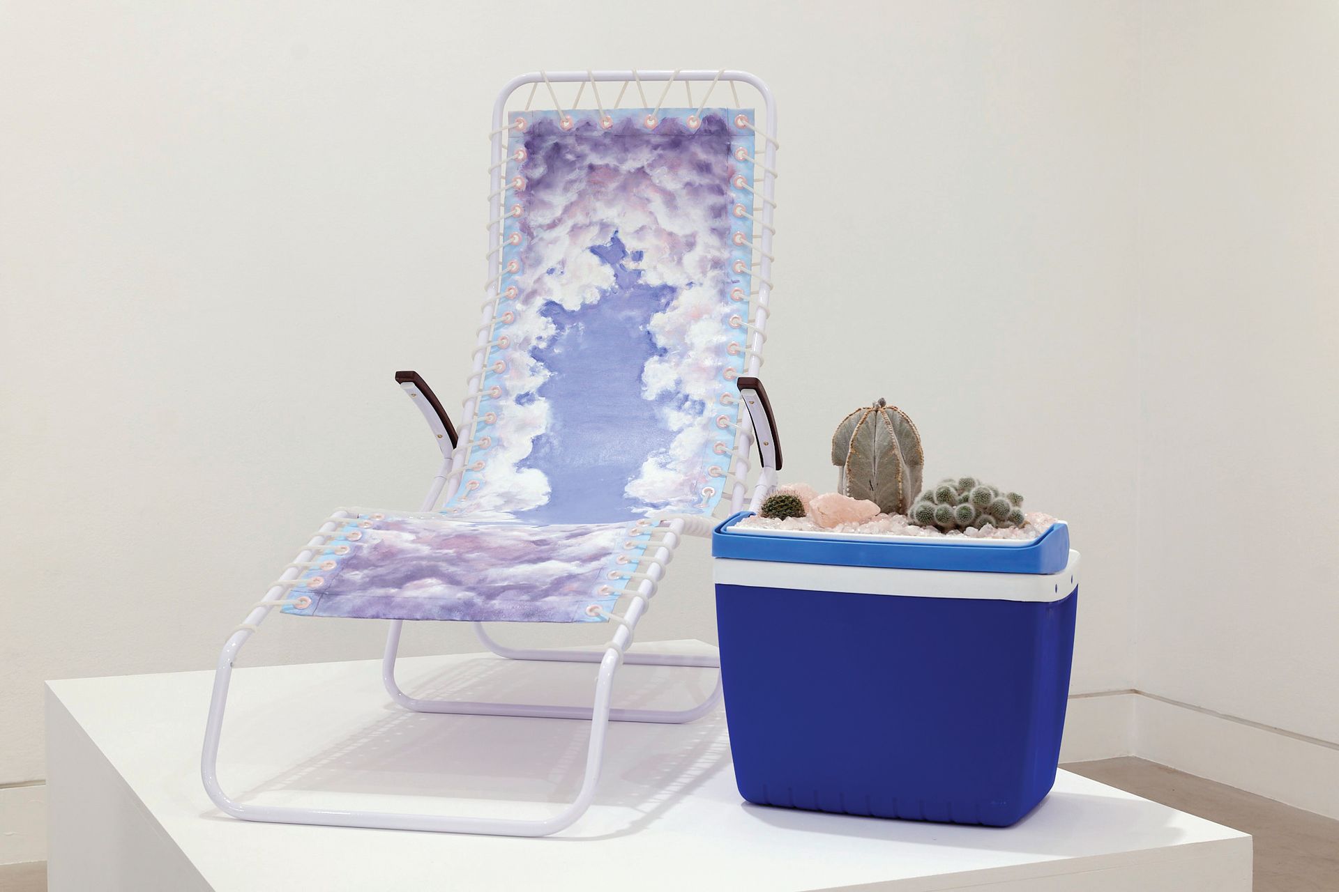 More spurious escapism is offered in Lydia Blakeley’s The High Life at Southwark Park Galleries. Here vibrant new paintings of shimmering pools, exotic vegetation and elaborate seafood platters—some painted directly onto sun loungers—are accompanied by sculptural cooler boxes filled with healing crystals and planted with cacti. But although Blakeley presents all the clichéd trappings of idyllic holidays, even down to the blue-skied view from airplane windows, everything is too pristine and perfect. In The High Life, the overall effect is ominous and disquieting rather than soothing and relaxing: sunlight is harshly, unforgivingly bright and the arrangements of poolside inflatables, oysters and octopuses are overly slick and immaculate.