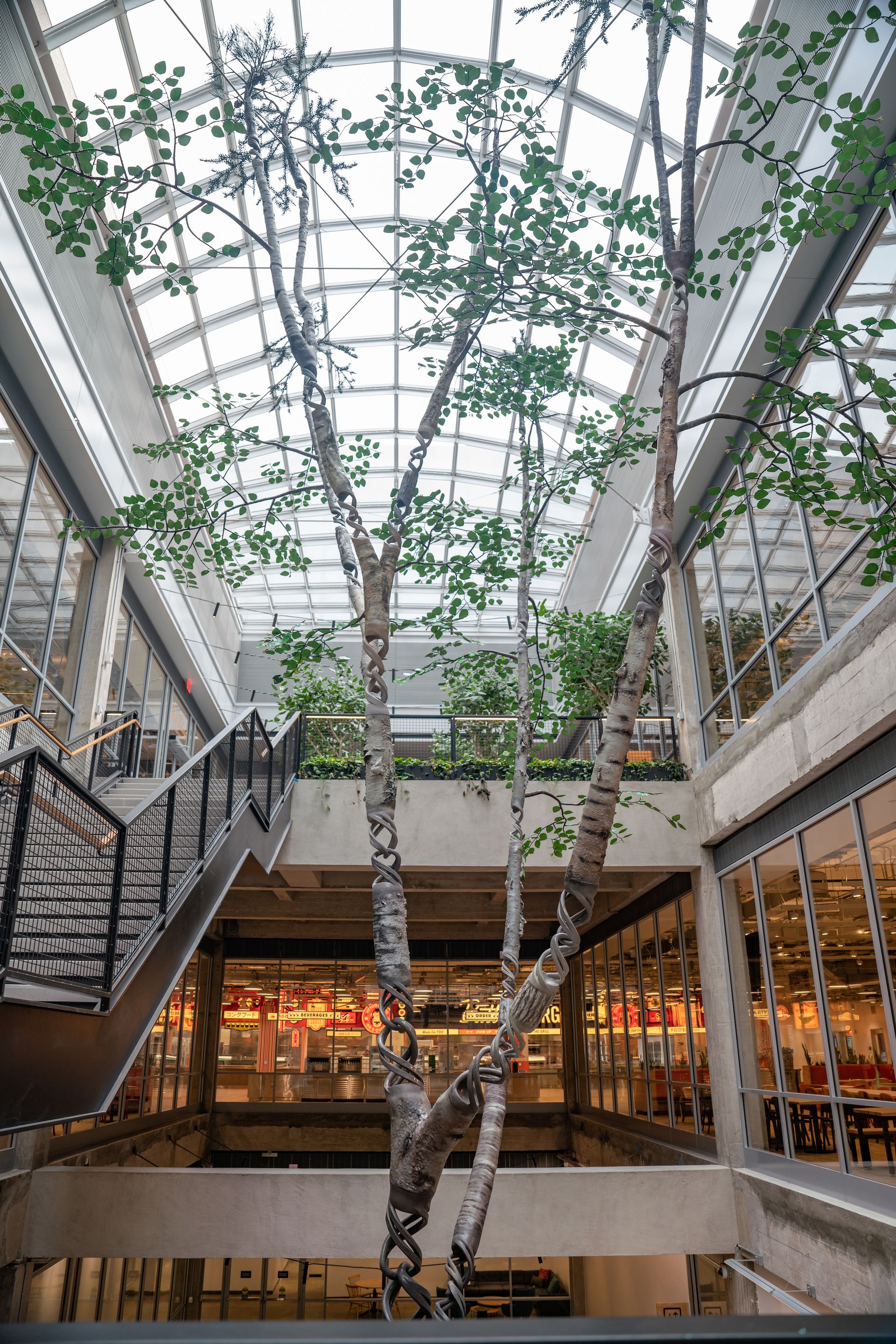 The offices, which span more than 700,000 sq. ft across five levels of the 1914 post office building, will have room for several thousand workers on any given day, serving as Meta’s New York City hub. The complex’s most eye-catching art commission, spanning several of those floors, is Si-Qin’s 50ft-tall Sacred Footprint (2022), a suspended two-ton steel and aluminium sculpture of a tree whose branches and trunk appear to dissolve into DNA-like helixes in certain places.
