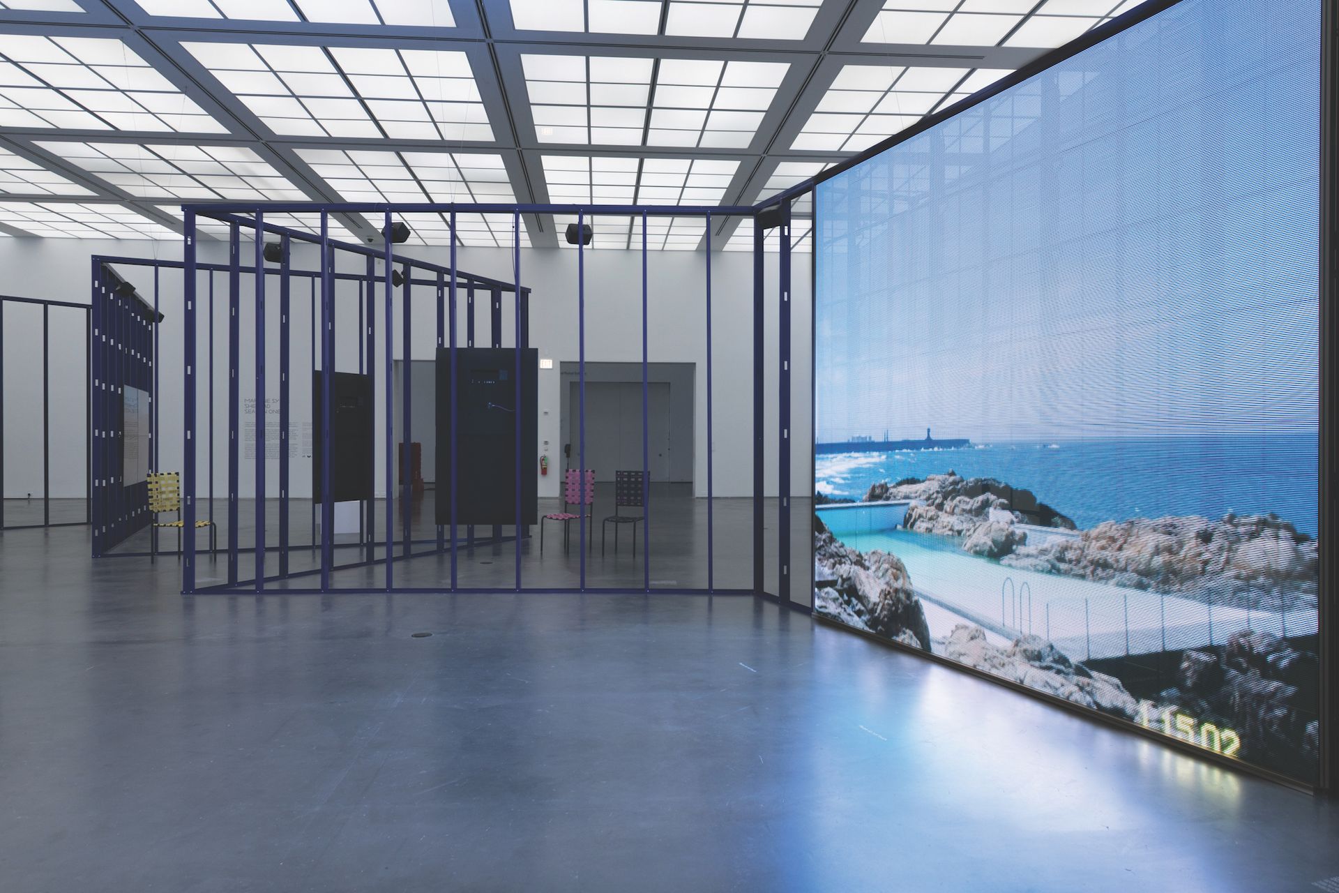 One of the possibilities offered by presenting TV-like work in an exhibition space is playing with the sense of linearity between episodes. Syms makes compelling use of the audio, with sound from one video blending into that of another. The steel structure that cuts across the space —painted a deep purple (Syms has said that her signature use of this tone forces people to say “the colour purple” aloud, referencing Alice Walker’s famed 1982 novel)—also allows for easy movement between episodes in any order: although placed chronologically, moving from right to left, the screens are installed on either side of the framework, and gaps between the girders make for easy passage from one viewing area to another.