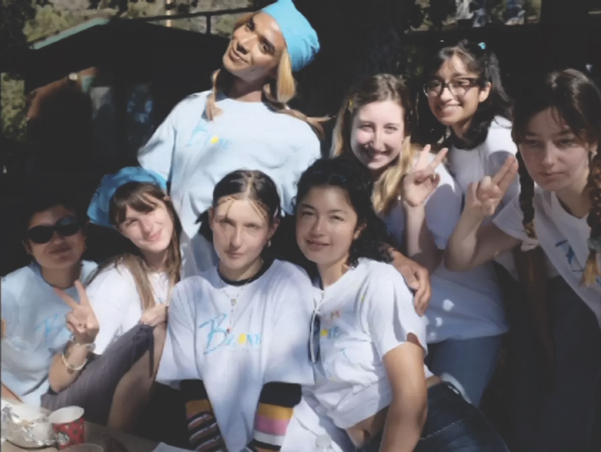 The last episode of She Mad, called Bitch Zone (2020), which plays on a large transparent LED screen set into the back corner of the steel structure, parodies the artist’s actual experience of attending a summer camp at age 13 run by the supermodel Tyra Banks. Set in the year 2000, the scene is acted out by Syms’s contemporaries (their impeccable early-Noughties fashion sense—centre-partings, puka shell necklaces and all—lends period veracity). A character named BBQ takes the stage in front of the seated campers and launches into a motivational speech about body positivity.