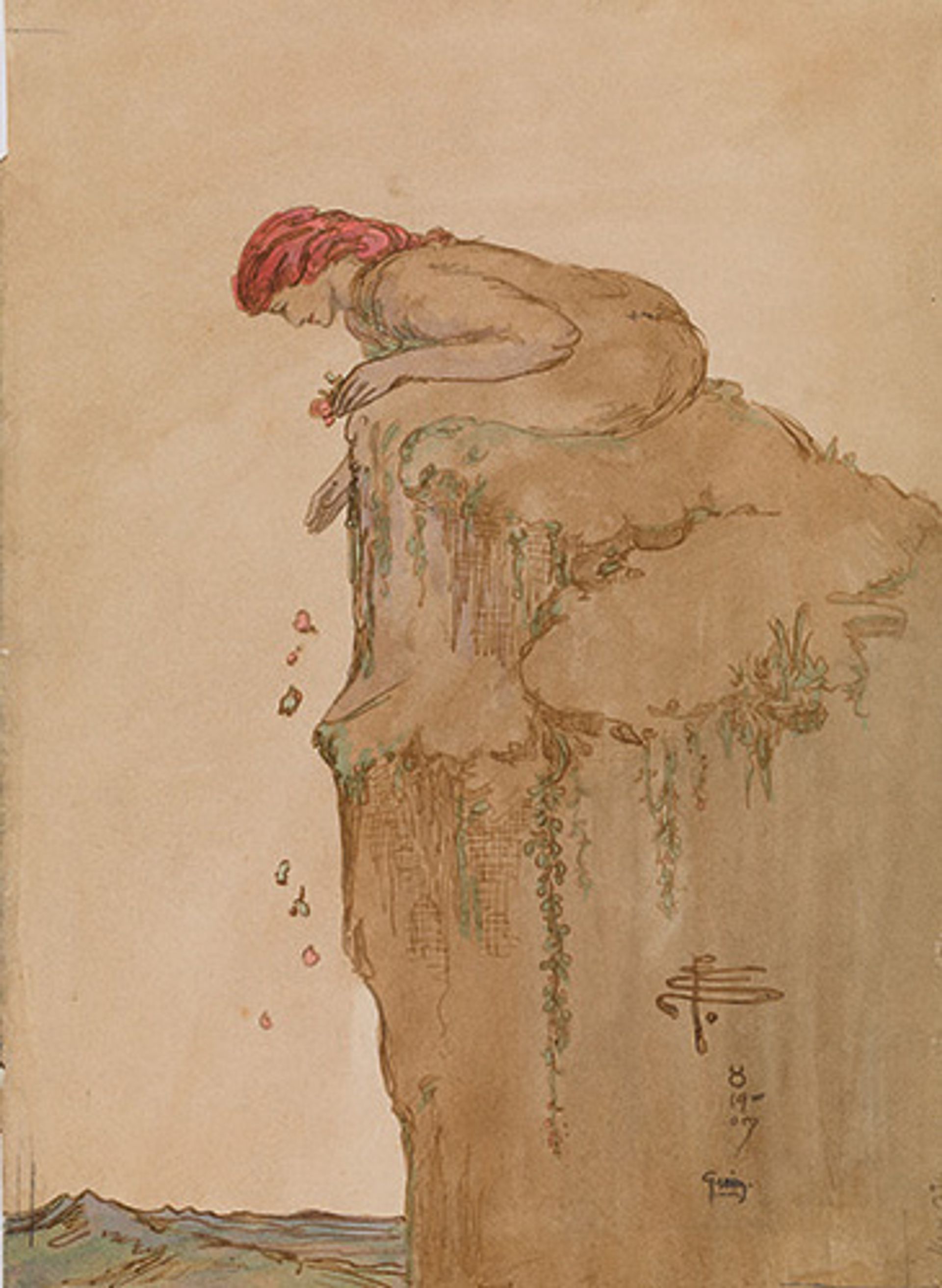 Pamela Colman Smith’s enduring legacy in occult visual culture and practices is perhaps most recognised in the illustrations she provided for the ever-popular tarot deck, the Rider-Waite Smith tarot. Grieg “Spring Song” is one of many works Colman Smith created through a process of musical influence, describing her images as “what I see when I hear music-thoughts loosened and set free from the spell of sound”. Colman Smith would transcribe the colours, form and visions of her synaesthetic experiences into her works. This piece was influenced by the Norwegian composer Edvard Grieg’s Våren (last spring). The figure evoked through the musical visions is situated—a little precariously—at a cliff’s edge, holding a flower from which petals drop over the precipice. The image echoes her tarot design for the fool, card number “0” of the deck, which signifies its position at the start and end of the tarot’s allegorical Major Arcana cards. The fool has associations of innocence and new beginnings, themes which resonate with Grieg “Spring Song” and the source musical composition. The work also features Colman Smith’s writhing monogram, which resembles a sigil (a symbol said to have magical properties).