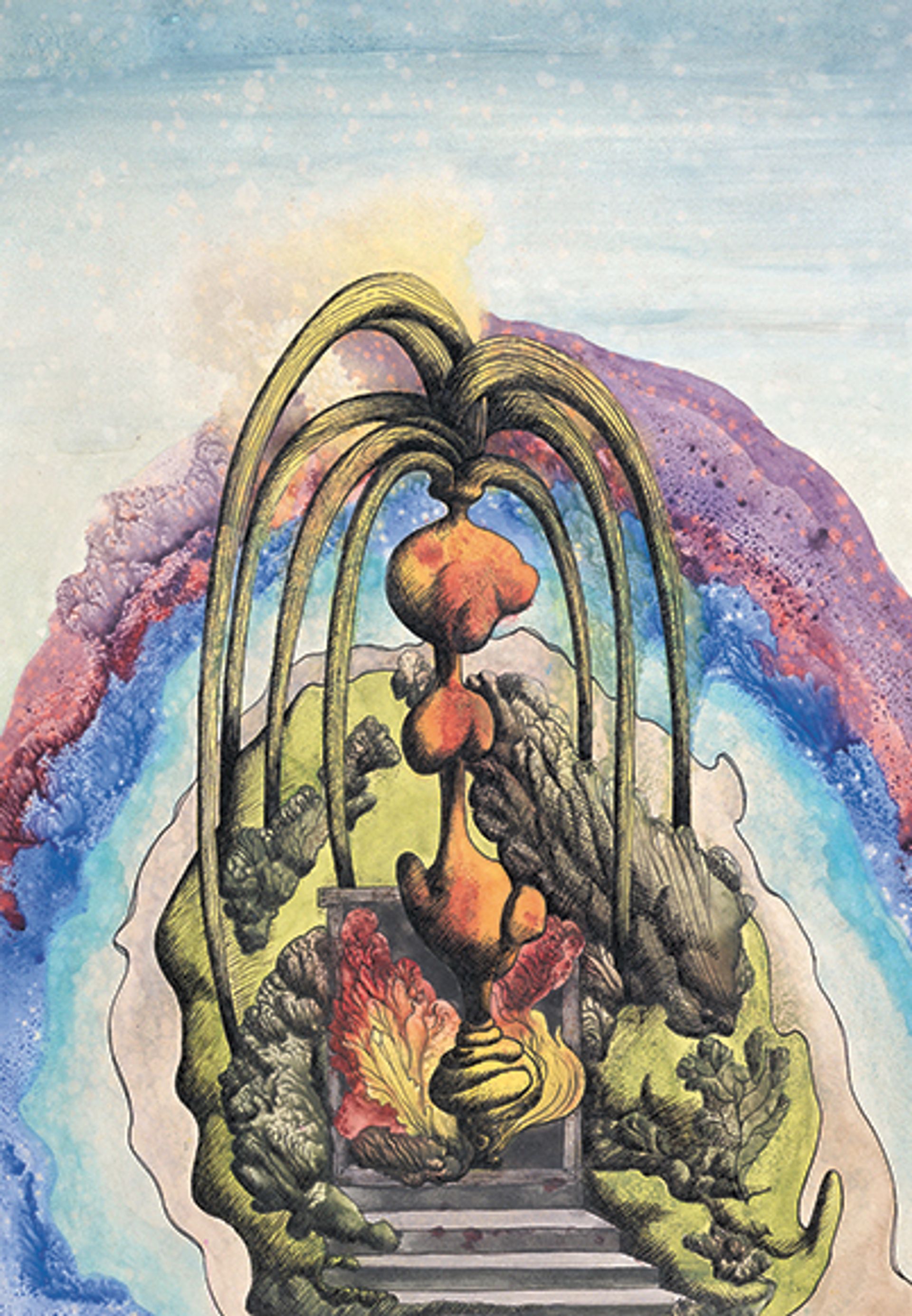 An important feature of a sacred landscape is the holy well, a source of natural-spring drinking water believed by some to have healing properties. When associated with a particular spirit or deity, these sites attracted worshippers who would make offerings and perform rituals. Erupting from below the earth’s surface, the well is thought to be a site of focused energy and a doorway into another world. The British artist and occultist Ithell Colquhoun captures this transformational spot in Santa Warna’s Wishing Well, in which darkness gives way to light and life. The well depicted is on St Agnes, one of the Isles of Scilly, off England’s southwest coast. Its narrow, stone-framed entrance chamber looks out across the bay where the figure of Santa Warna is said to work her powers, wrecking ships that might threaten the island’s inhabitants. Three stone steps lead from the entrance down to the well, where freshwater miraculously pools, despite the site’s proximity to the sea. Venerated wells such as this predated Christianity’s arrival in Britain, when an act of syncretism saw the sacred sites’ devotions reassigned from pagan deities to Christian saints to continue to accommodate for the community’s spiritual needs. Colquhoun’s work incorporates elements of decalcomania, a blotting process where wet paint is transferred from one surface onto another. Decalcomania was one of the many automatic techniques Colquhoun used in her work; the resulting images were directed in part by chance and then worked in by the artist to fully realise her otherworldly visions.