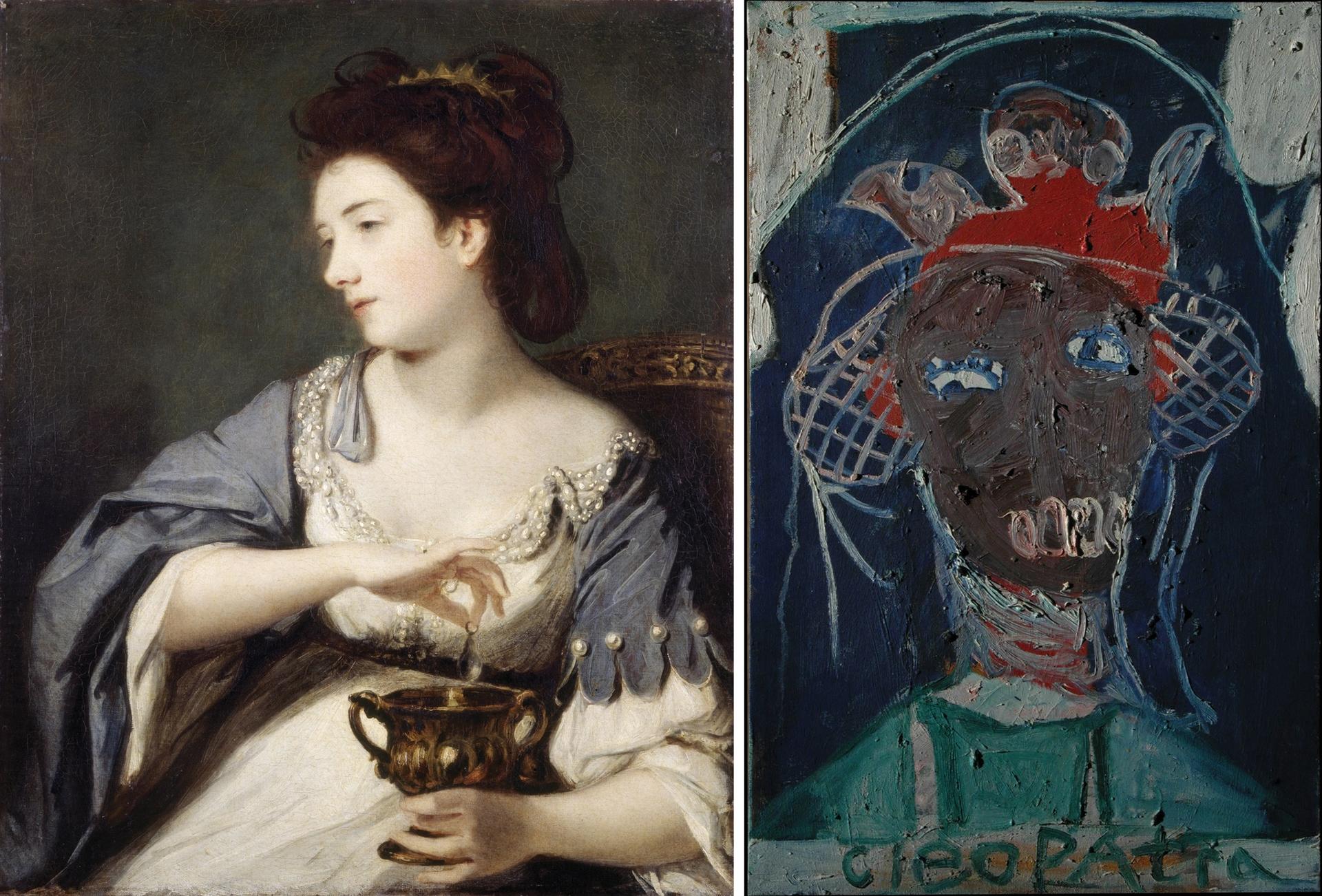 Two visions of Cleopatra: Joshua Reynolds's Kitty Fisher as Cleopatra Dissolving the Pearl (1759, left) and Chris Ofili's Cleopatra (1992, right). Reynolds: © Historic England Archive; Ofili: © Royal College of Art