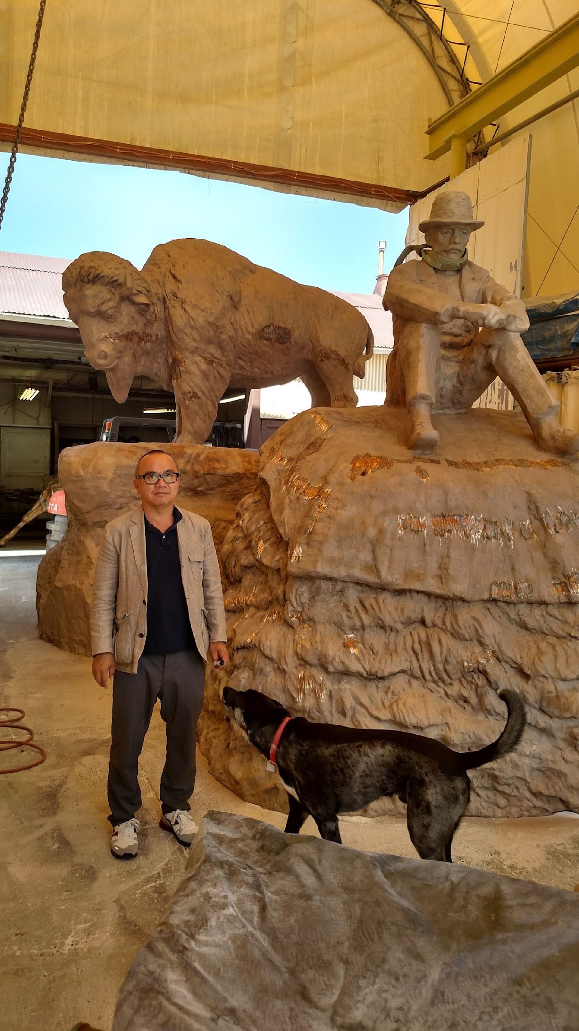 Ken Lum and his sculpture The Buffalo and the Buffalo Fur Trader (2016) Courtesy the artist