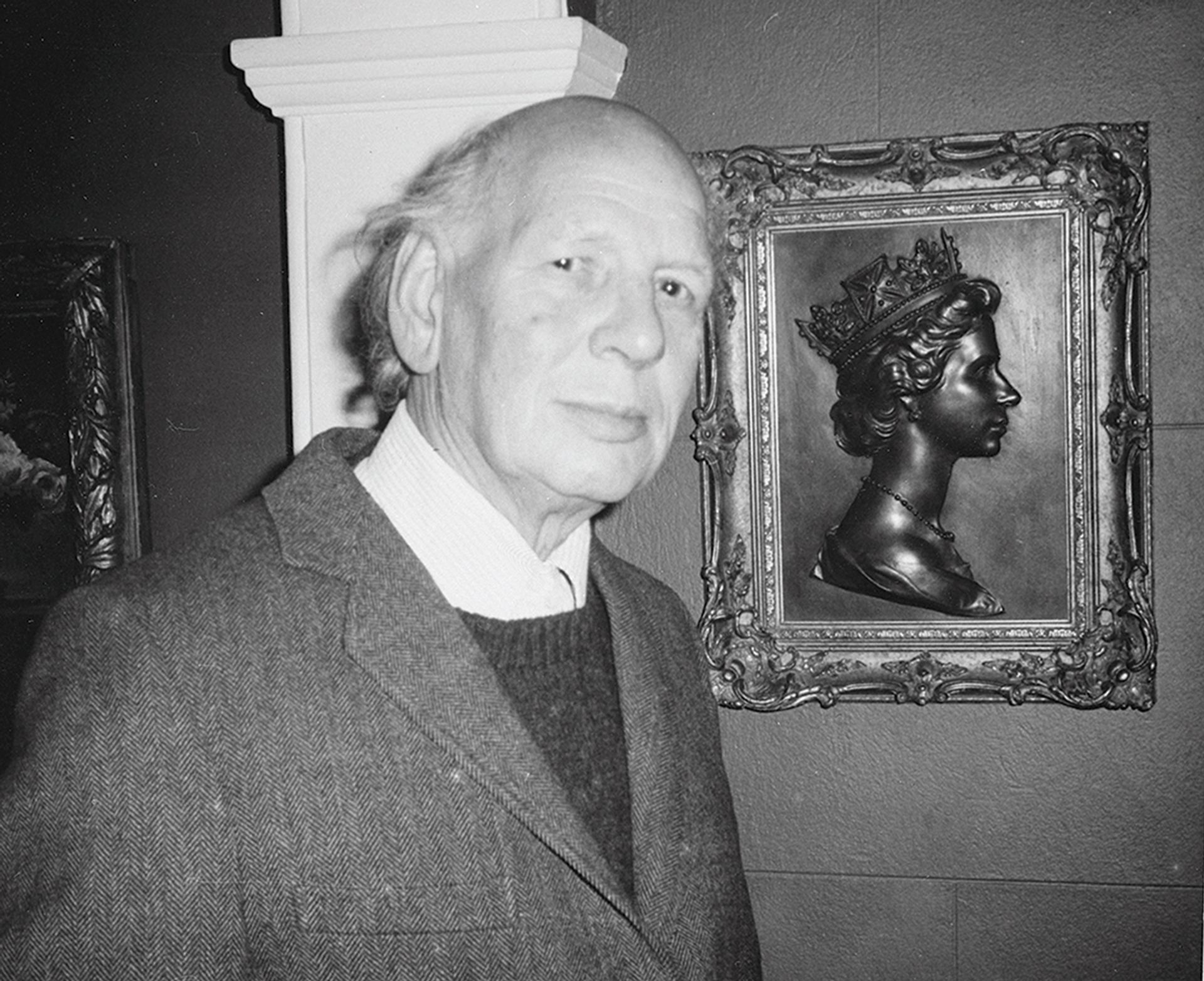 Arnold Machin with the relief portrait he made of the Queen—which is known to have pleased her—for the Royal Mint Supplied by The Royal Mint Museum