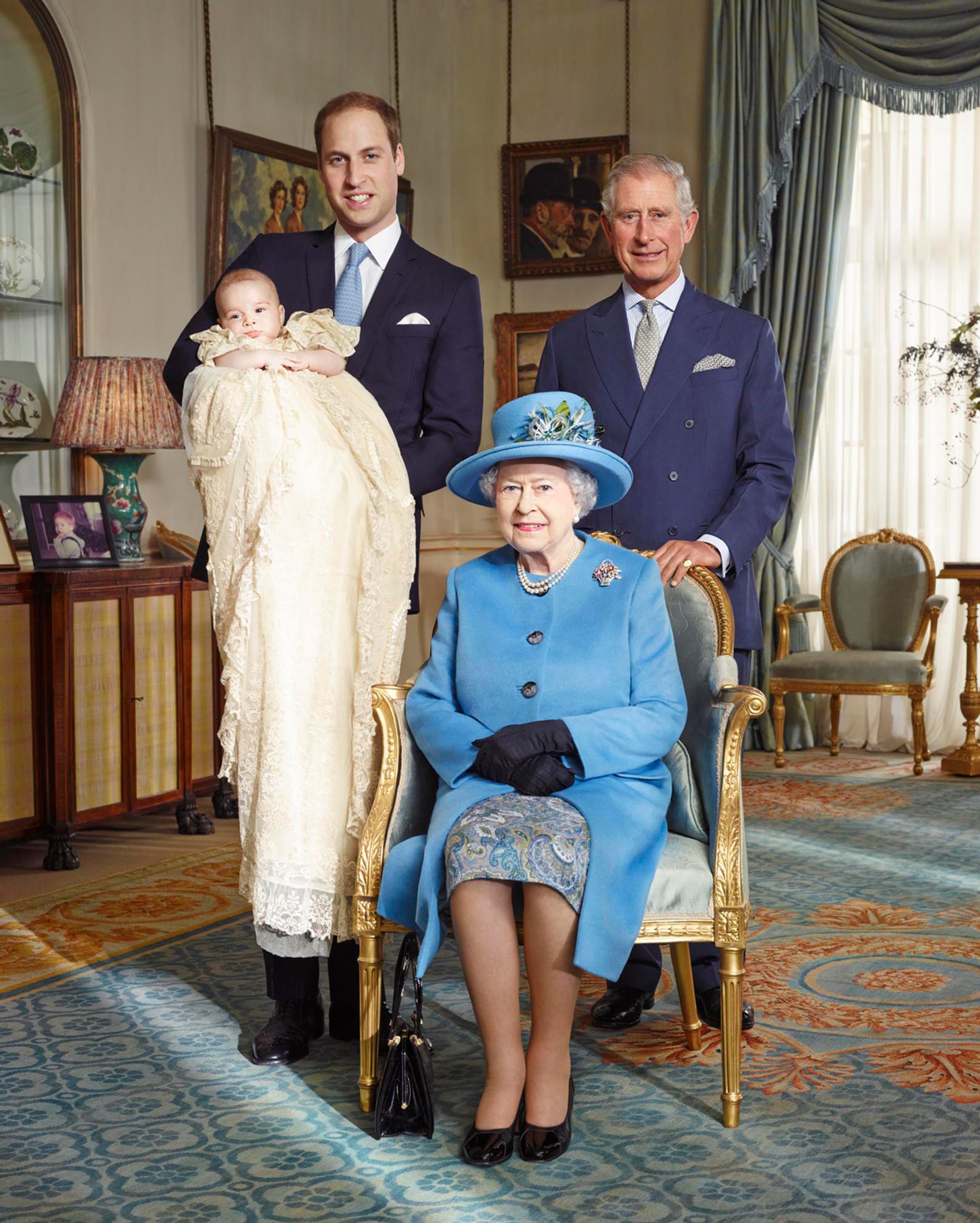 The Queen with three heirs apparent: her son Prince Charles, her grandson Prince William, and her great grandson Prince George on his christening day, 23 October 2013 © Jason Bell/Camera Press