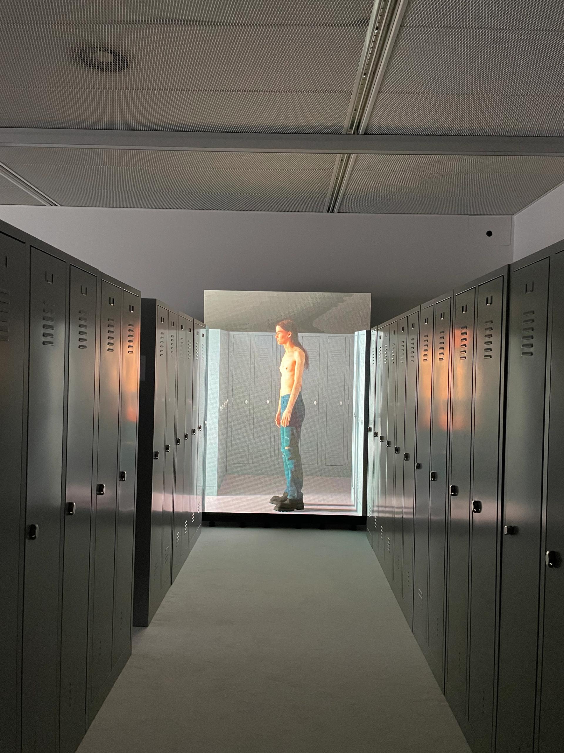 Imhof has responded to this question by creating what she terms "avatars": digitally animated 3D versions of Douglas that appear on screens throughout the show; most are embedded within installations; in one instance, an avatar appears like an apparition at the end of narrow locker-lined corridor. Imhof's use of avatars also allows her to consider fundamental questions about the nature of humanity, and our treatment of those considered non-human. These anxieties she says already existed prior to the Ukraine war, but have only deepened since.
