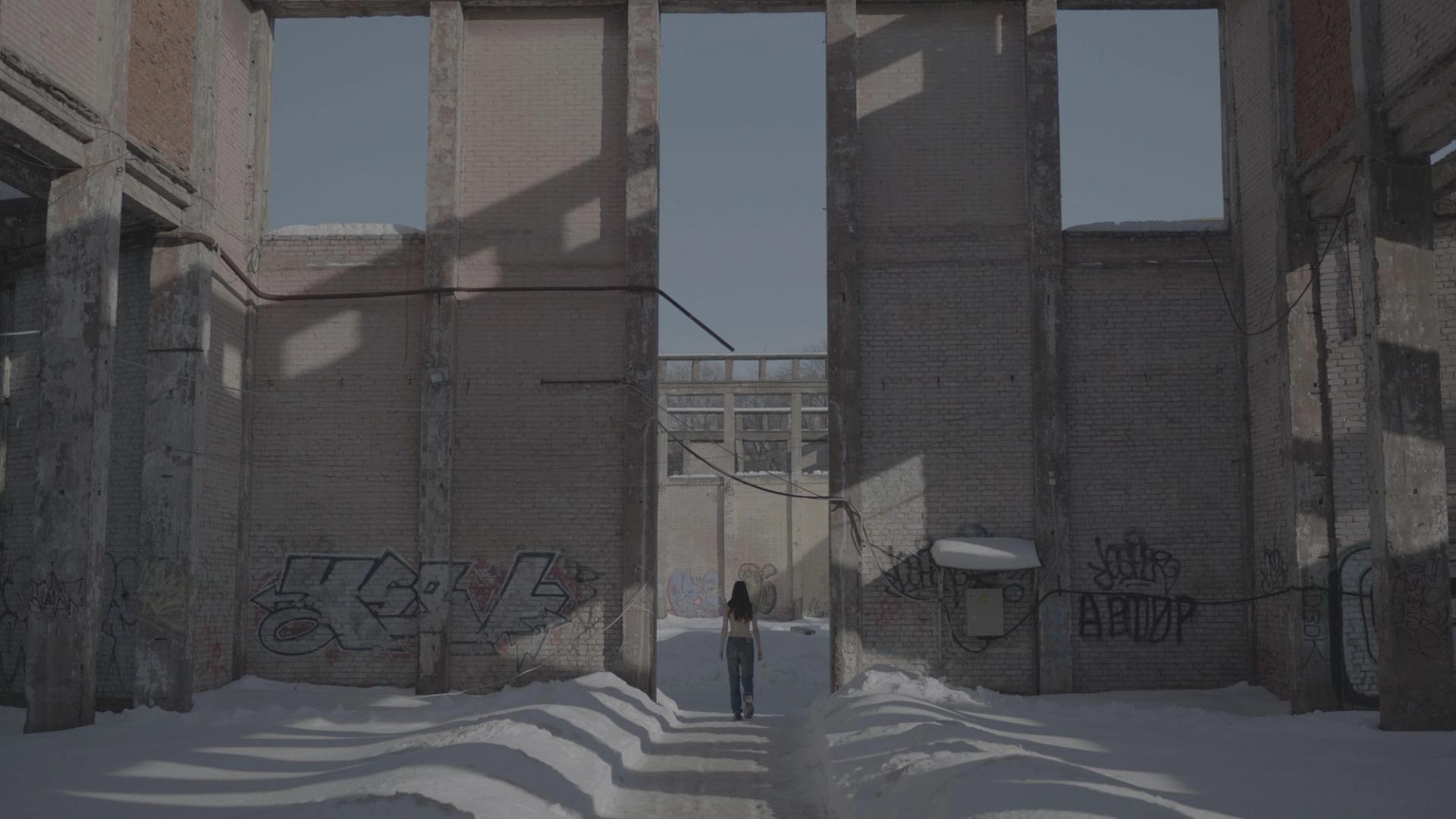 Both films on display were shot in Moscow, although neither makes obvious reference to the impending conflict. One shows a herd of horses galloping through a Soviet-era social housing block in Moscow; another features Douglas walking topless through the snowy courtyard of a dilapidated Neo-Classical building near the Garage Museum.