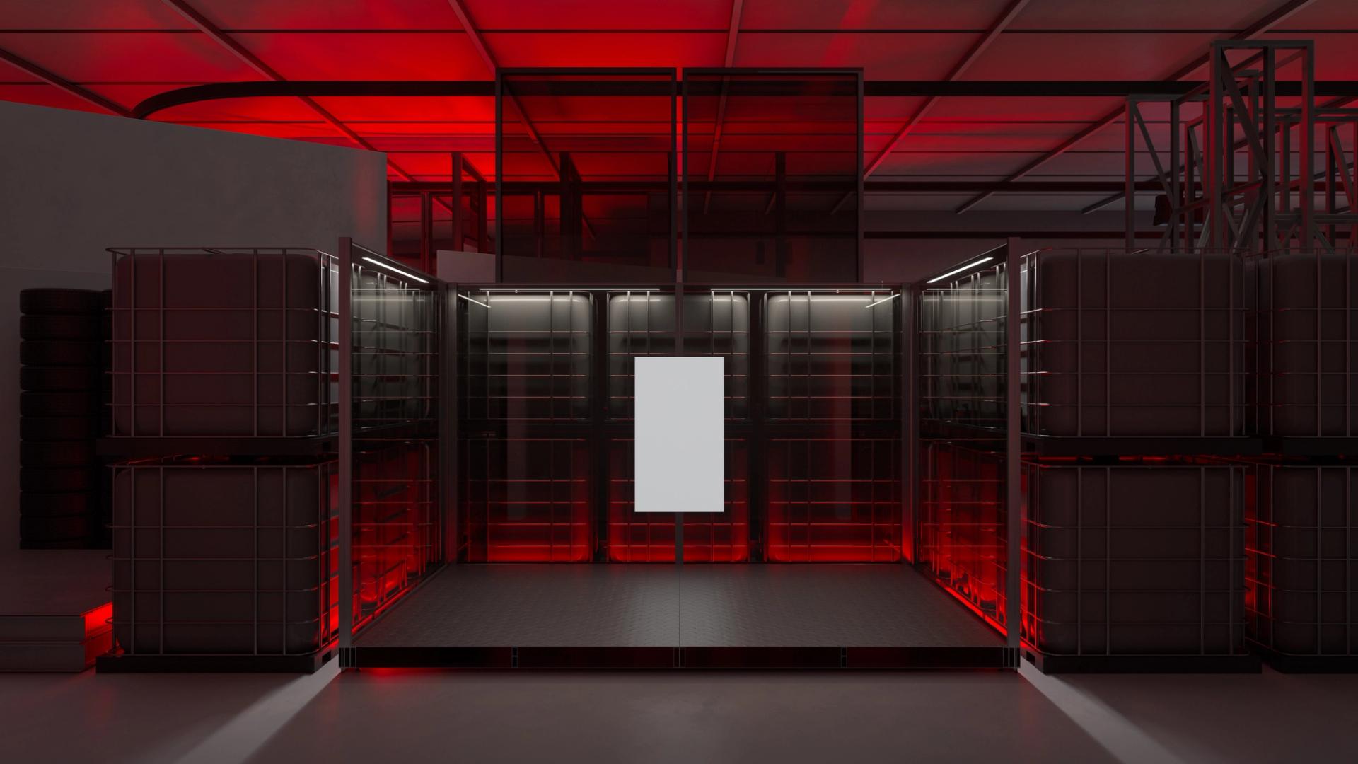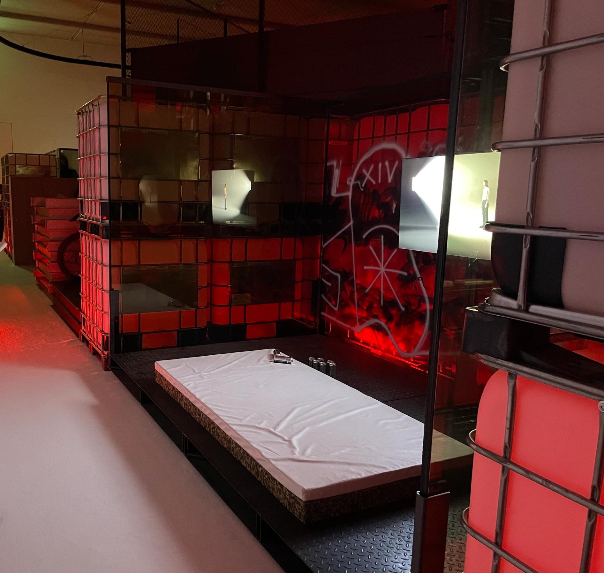 The exhibition is divided into two large rooms, each of which is filled with structures that obstruct the viewer's movement through the space. The first, bathed in harsh red light, sees objects such as water tanks, stacks of tyres and empty plastic crates block out much of the central space. These are arranged to form a dense, warren-like structure that resembles a junk yard, into which viewers can peer as they skirt around its circumference. Placed at various sections are installations that function as tableaus, though crucially devoid of people, which suggest the remnants of wild parties and illicit activities: a mattress marked with spray paint and littered with beer cans; a motorcycle parked next to a laundry bag filled with empty gasoline cartons. Each scene signals the assiduously cool aesthetic that Imhof has made her trademark.