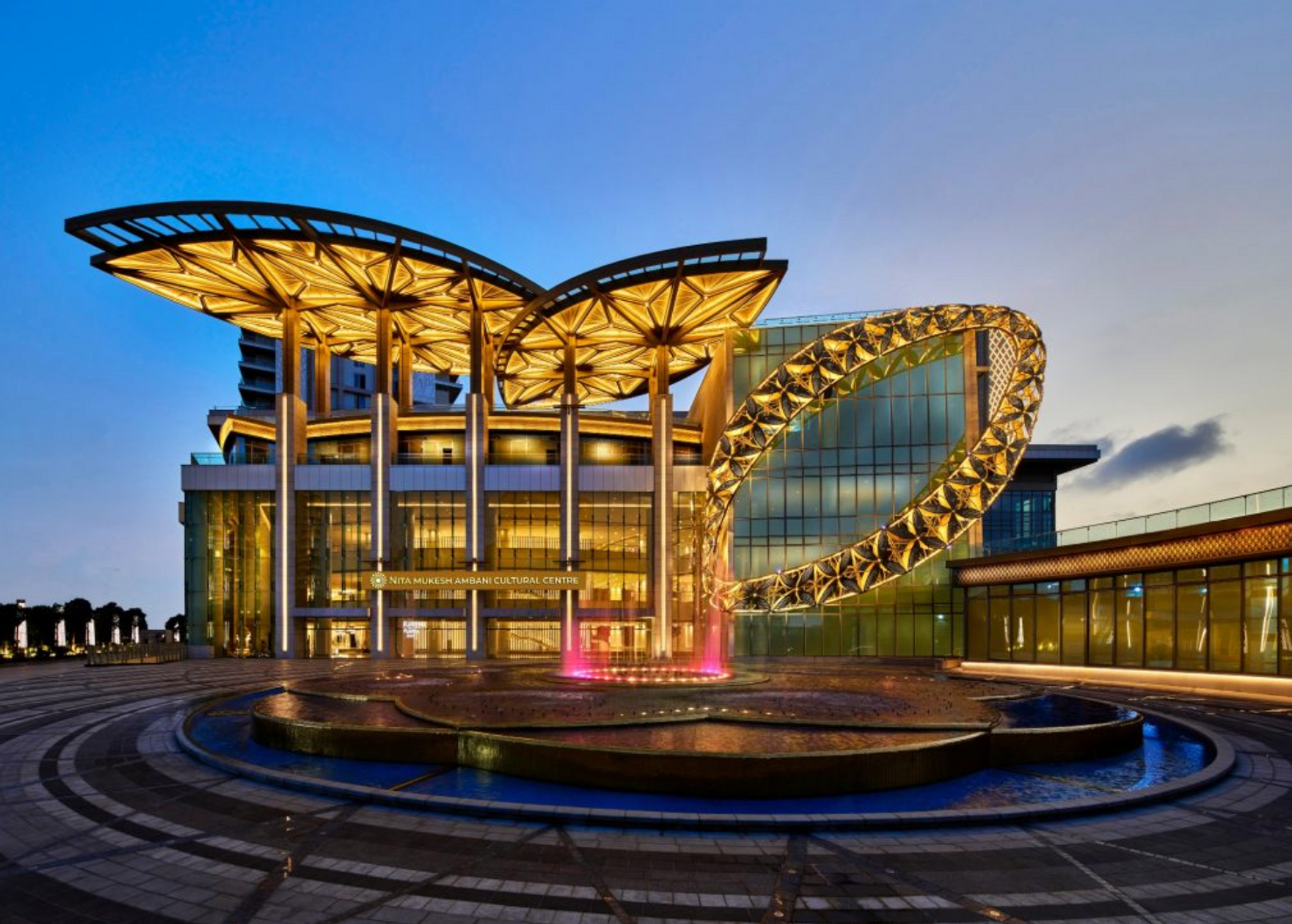 The facade of the NMACC at the Jio World Centre in Mumbai, India. Photo courtesy of the NMACC