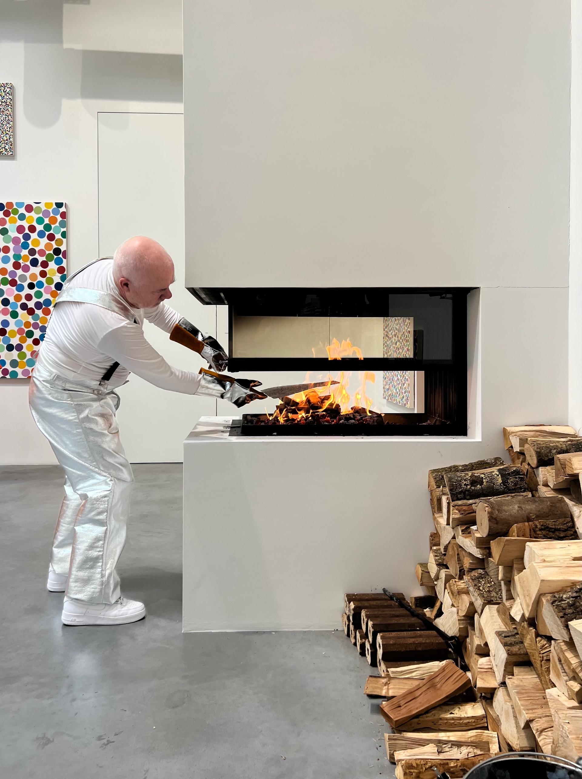In a ritualistic ceremony at his Newport Street Gallery, today Damien Hirst began incinerating 1,000 of his own works from his first NFT (non-fungible token) collection. “What a weird day,” commented the artist, dressed in silver protective trousers and matching gloves, as he put the first piece, appropriately titled Totally Gonna Sell You into one of six custom-designed sculptural wood-burning fireplaces at his gallery.
