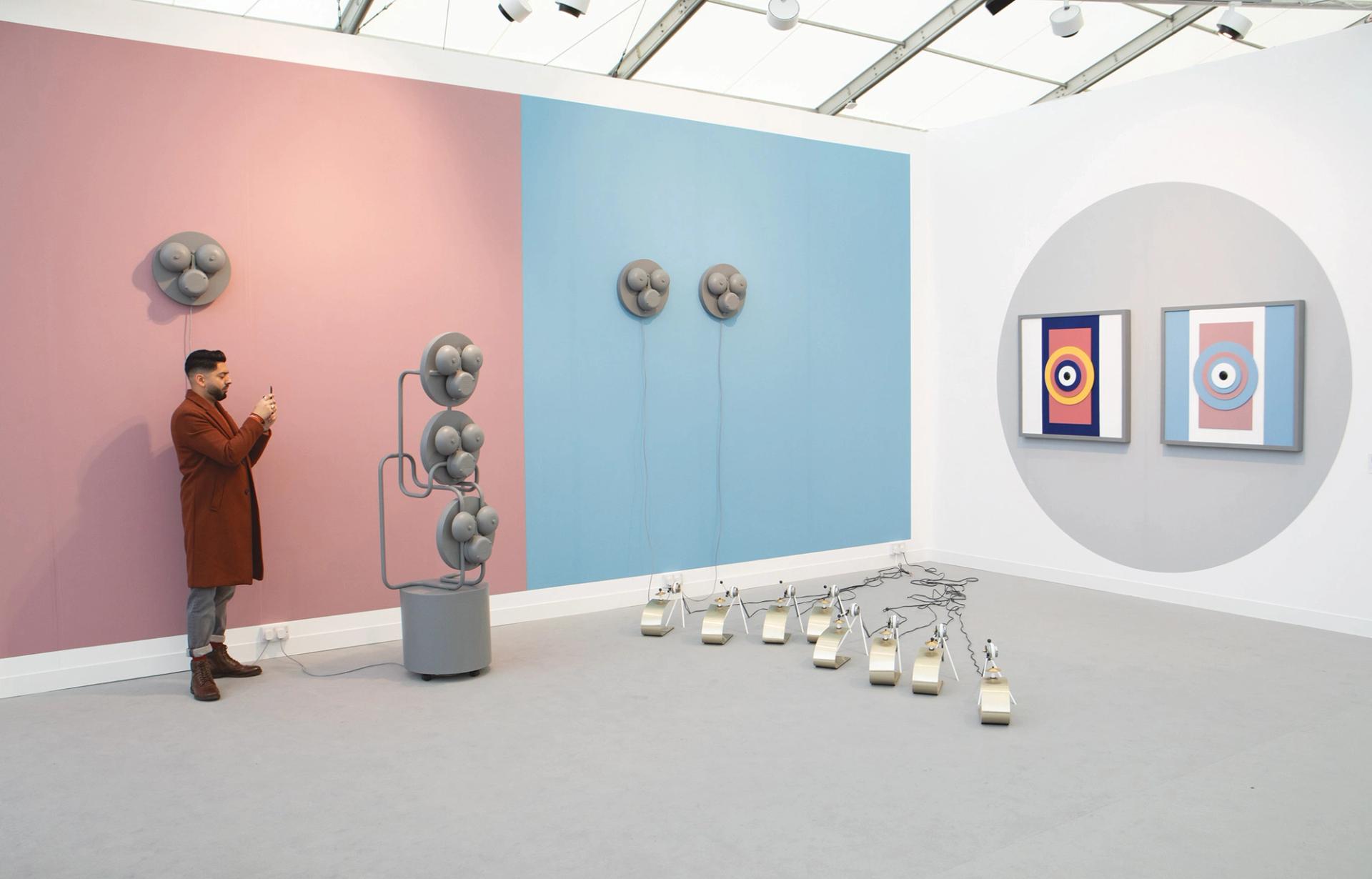 Kurismaa was born in Estonia in 1939 and was a leading figure in kinetic and sound art during Soviet times. His work from that period no longer exists, but his installation at Frieze reflects 25 years of practice. On the floor is Intermezzo (1997), in which tiny cymbals mounted on folded metal strips are struck by mechanised beaters, prompting gentle ringing that can be heard across the Focus section. Also on view are sculptures made with clusters of school bells painted grey and works in which ticking timers are set within circular forms made with layers of painted wood. Wall paintings complete the setting for an intriguing sonic and visual ensemble.
