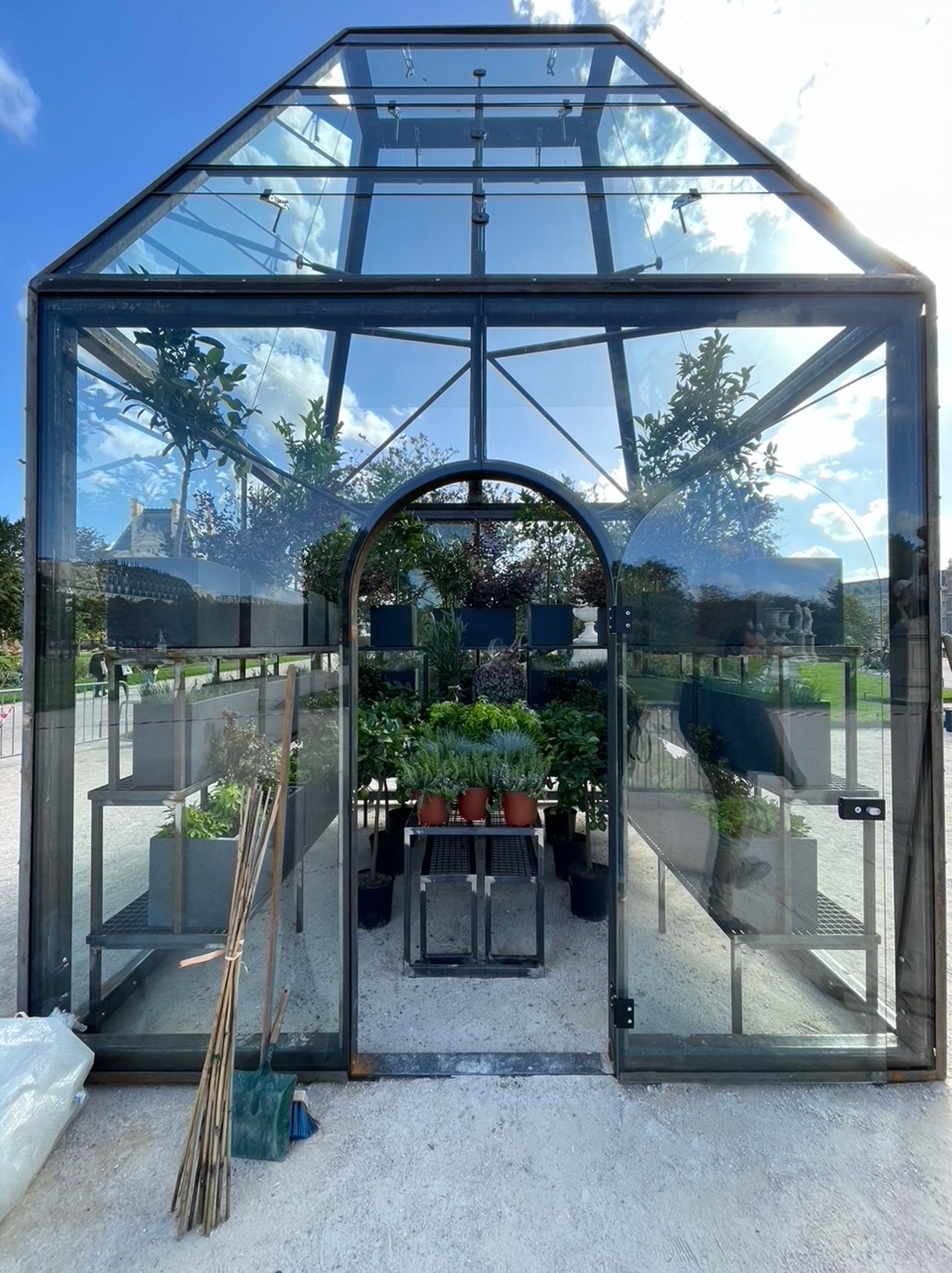 The first modern greenhouses were built during the Renaissance to protect plants, in particular collections of rare and exotic species. In addition to their primary function, orangeries, like the one at the Château de Versailles, were places of social interaction and a venue for festivities of all sorts. Made of steel, glass and aluminium, The Green Pavilion (June 2022) by French architect Odile Decq, evokes these functions: a table placed in the middle and bearing bread, wine and fruits and vegetables grown under glass evokes these festivities.