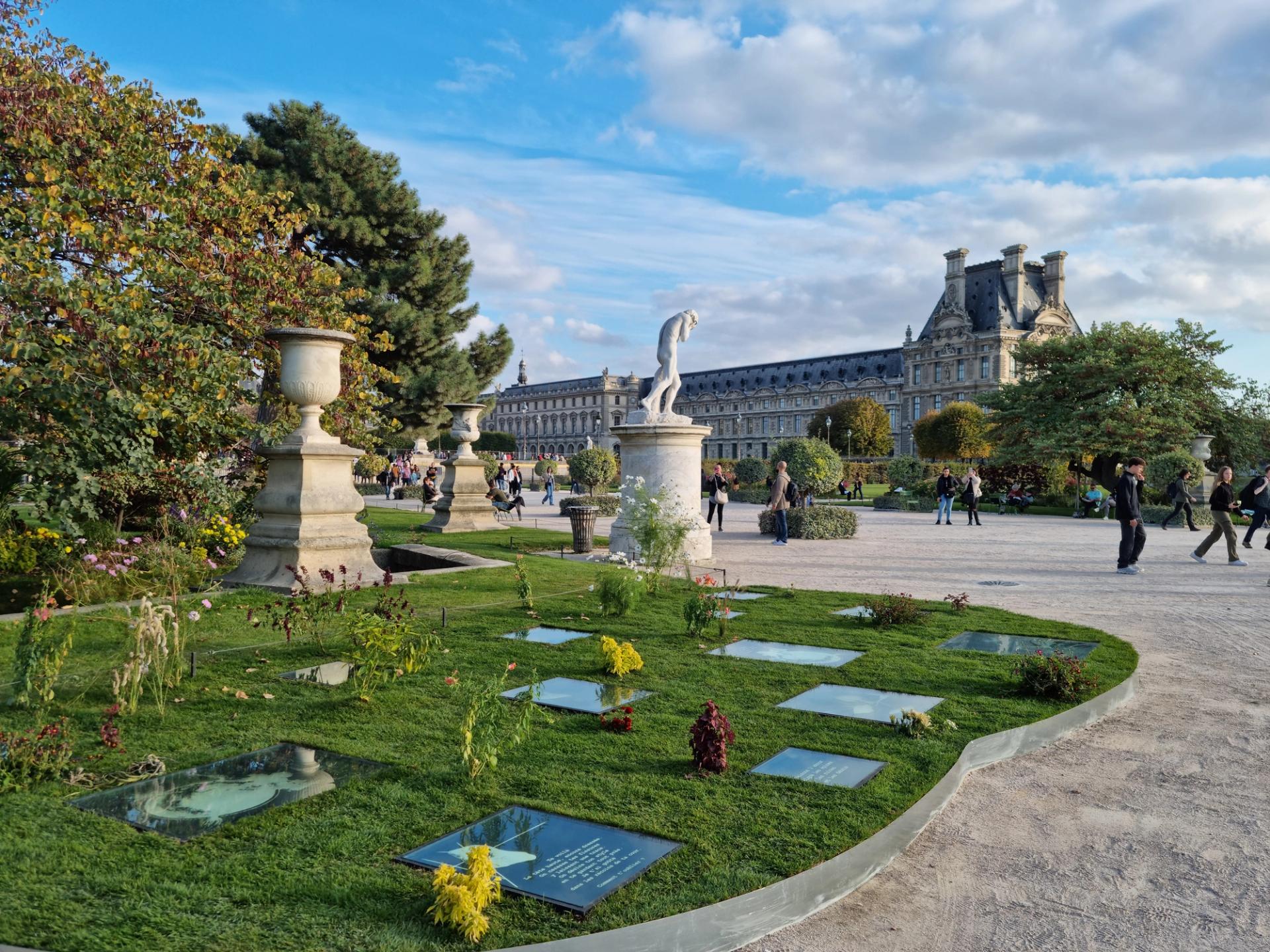 Nigerian visual and performance artist Otobong Nkanga lives and works between Belgium and Nigeria. She questions the notion of land, the historical structure of a place—here, the Tuileries—and the worth attributed to natural resources. With Anchored Glow (2017), Nkanga has devised an installation made up of 13 light boxes decorated with sketches and poems inserted into the ground in a topographical garden. By combining poetry and drawing, she fosters a thoughtful and contemplative mood that enchants the visitor.