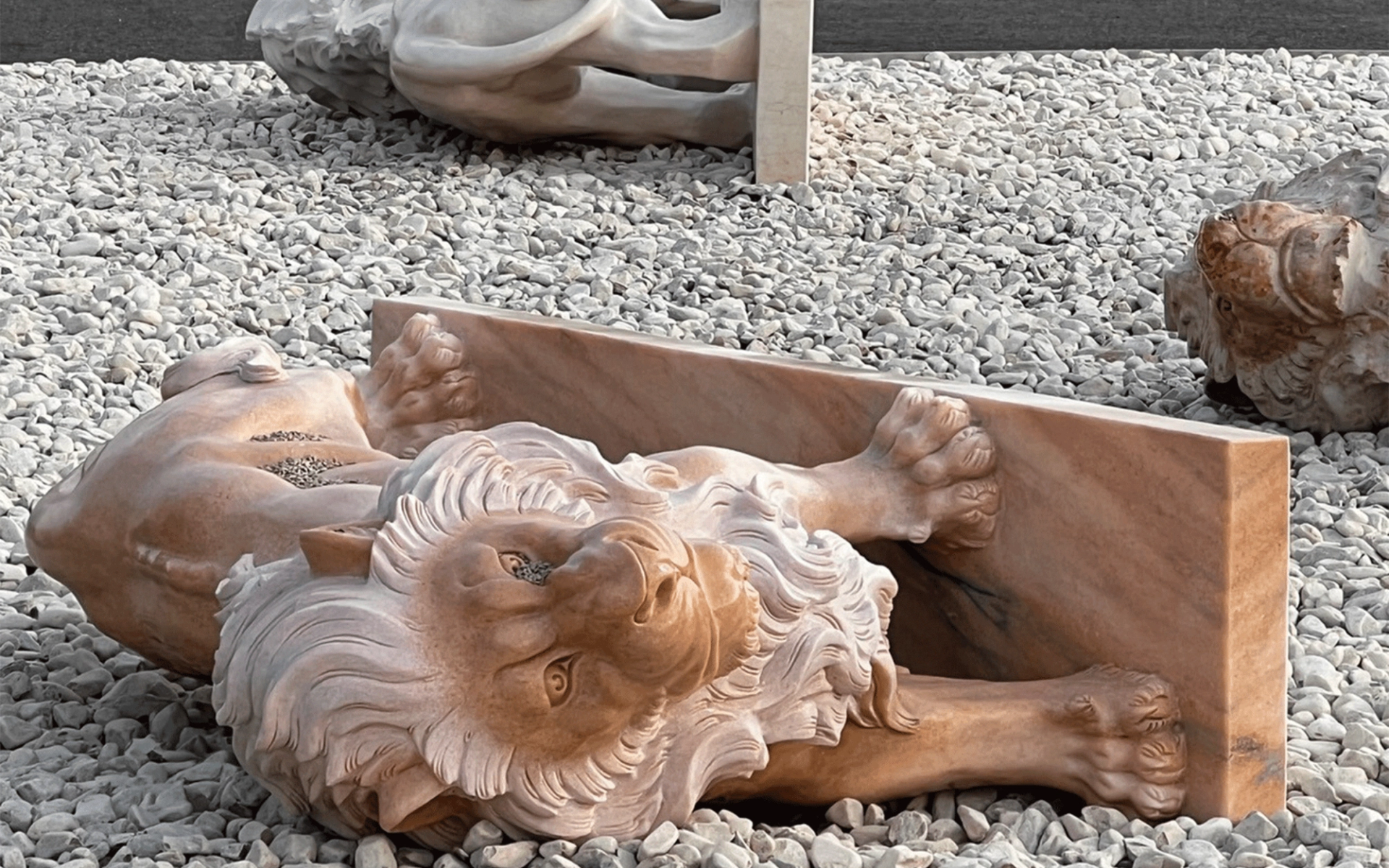Jointly represented by two galleries, Danish designer Nina Beier presents Guardians (2022). Four marble lions lying on the ground embody the revival, albeit ironic, of antique statuary. Stripped of their architectural and ornamental functions, the lions seem to be resting after returning to the wild. Here, Beier is reflecting on the life of monuments whose original raison d’être has disappeared, but whose former nobility remains intact allowing them, as in the Tuileries, to conquer a new space.
