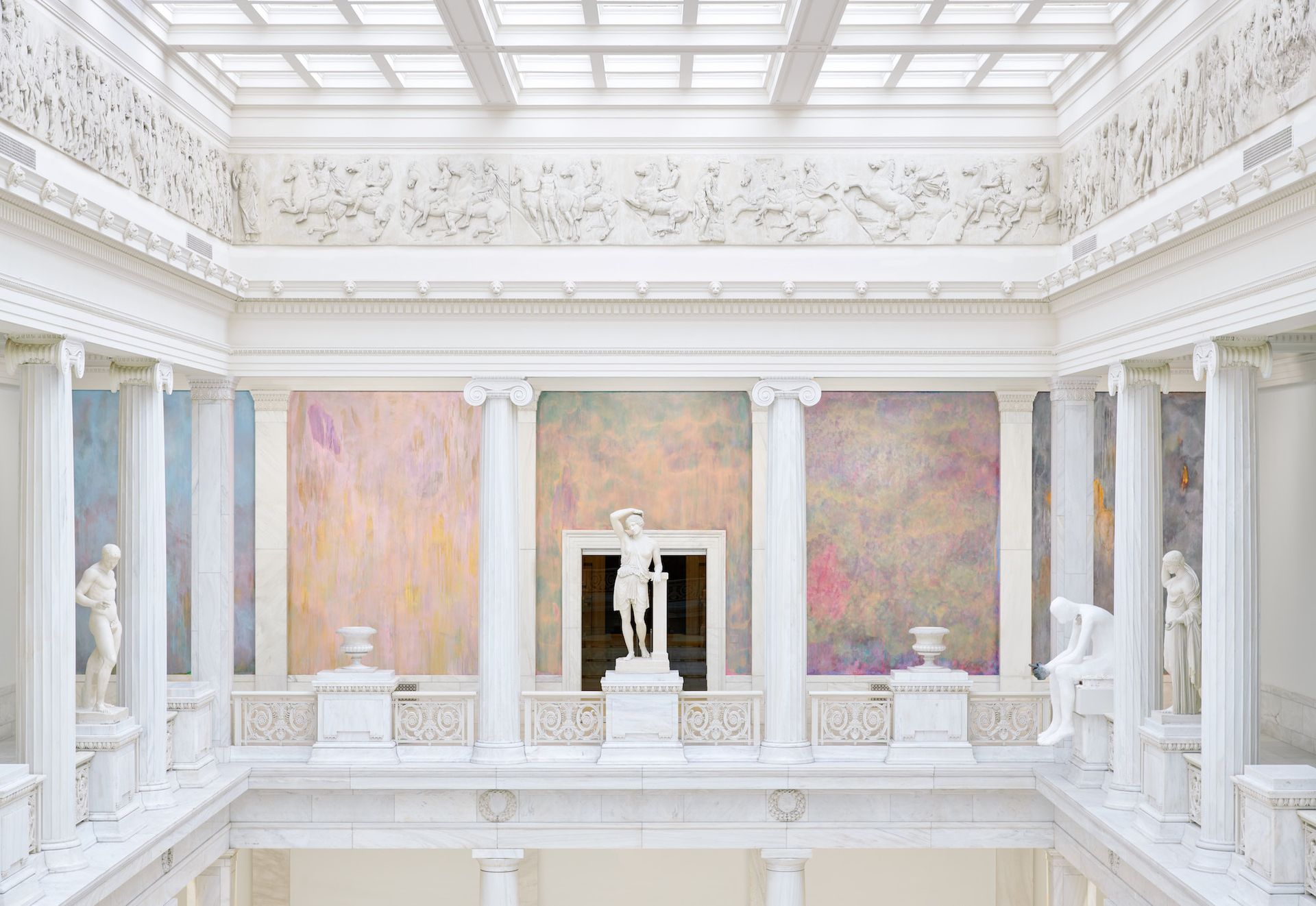 In the museum’s central atrium, Paris-based Vietnamese artist Thu Van Tran infiltrates the space with an arresting series of frescoes entitled Colors of Grey, a reference to the chemical agents known as “Rainbow Herbicides” used by the US military to decimate 4.5 million acres of nature during the Vietnam War. Layering white, pink, green, blue, purple and orange hues onto the walls of the hall, designed after the Greek Parthenon to house the museum’s collection of plaster-cast replicas of Greek antiquities, Tran “stains” the room a melancholic grey, symbolically subverting the suppositions of authority implicit in the institutional white walls.