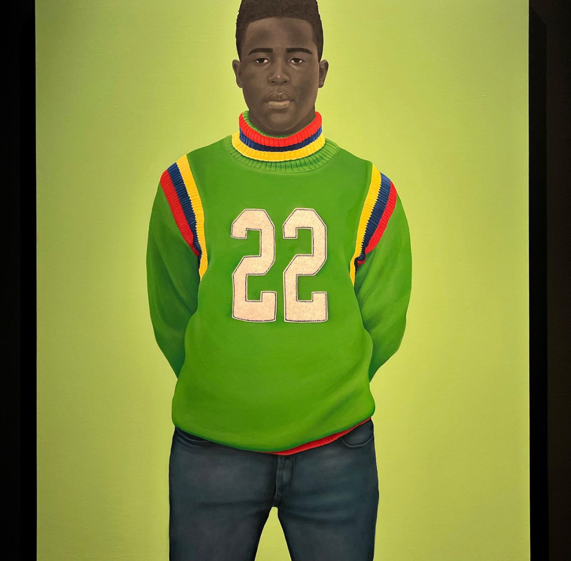 At American portraitist Amy Sherald's first European show, in the far corner of the second room, is a striking portrait of Sherald’s nephew. He was meant for all things to meet (2022) depicts the boy against a luminous green backdrop, with the bright-white emblazoned “22” on his varsity jumper taking on the quality of regalia. However, with Sherald’s characteristic absence of place and use of grisaille, the work resists easy interpretation as a commemoration of “Black excellence”. It’s instead an intimate moment designed around the sitter, as the viewer is invited to contemplate his life.