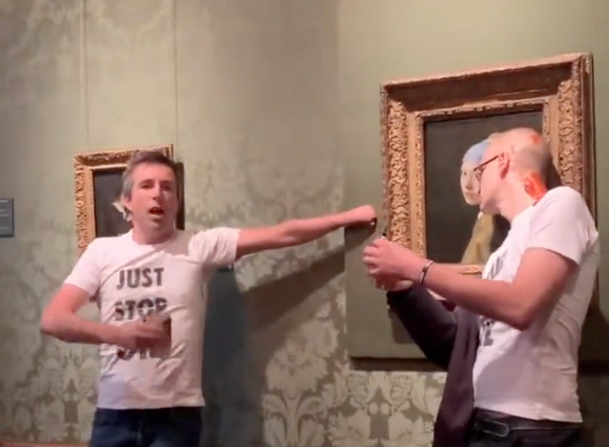 A video published on social media today shows two men standing in front of the work, which hangs in the Mauritshuis museum in The Hague. One attempts to glue his head to the Dutch Golden Age masterpiece, which is displayed covered in glass. The other pours a can of unidentified red liquid over the gluers head, possibly in reference to a recent action by the group Just Stop Oil in which two demonstrators threw tomato soup on Van Gogh's Sunflowers. The stunt on 14 October at the National Gallery in London has fuelled many headlines and provoked widespread debate as to whether their means of protest were justified.