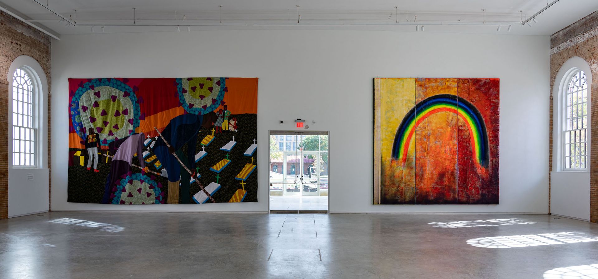Installation view of What's Going On featuring works by Christopher Myers (left) and Vaughn Spann (right) Photo: Chi Lam